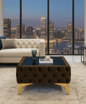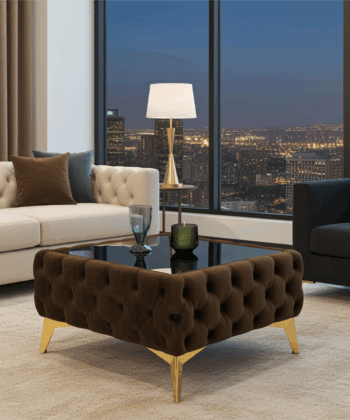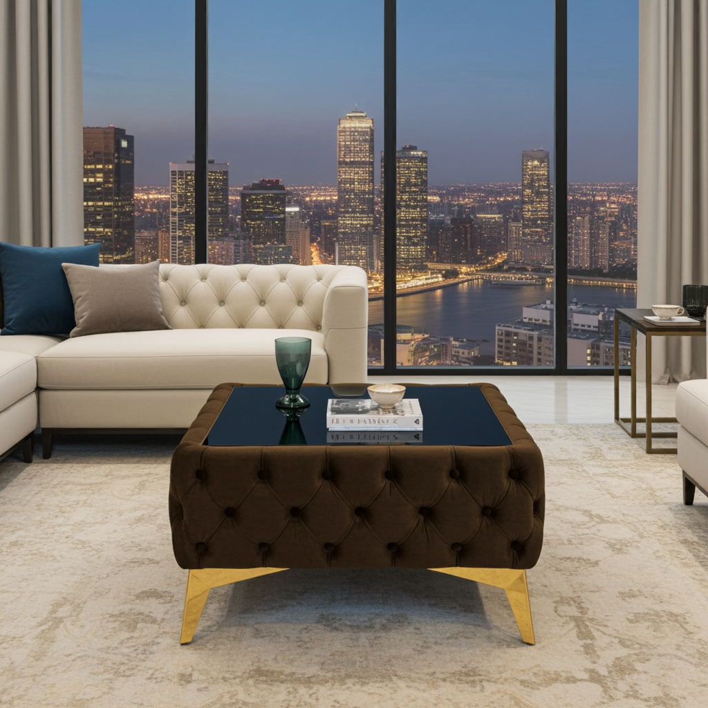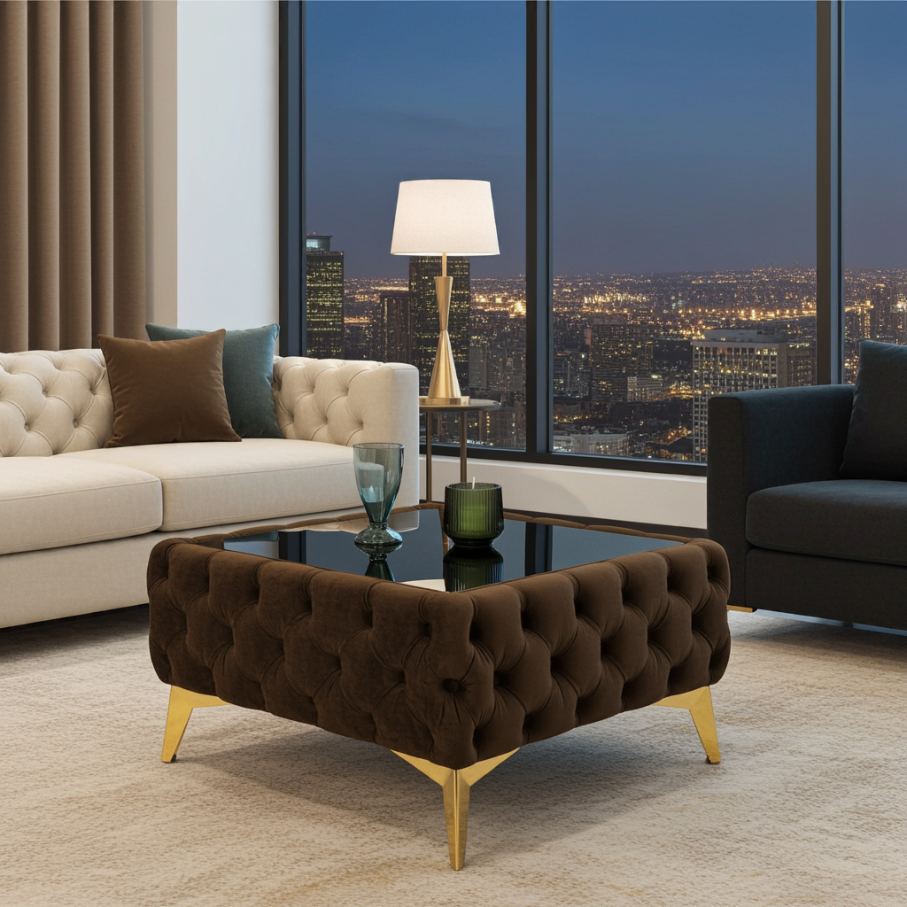 An elegant 63×63 cm coffee table upholstered in premium velvet with Chesterfield-style tufting. The top features tinted glass for a modern touch. This product is available in custom sizes (read more below).