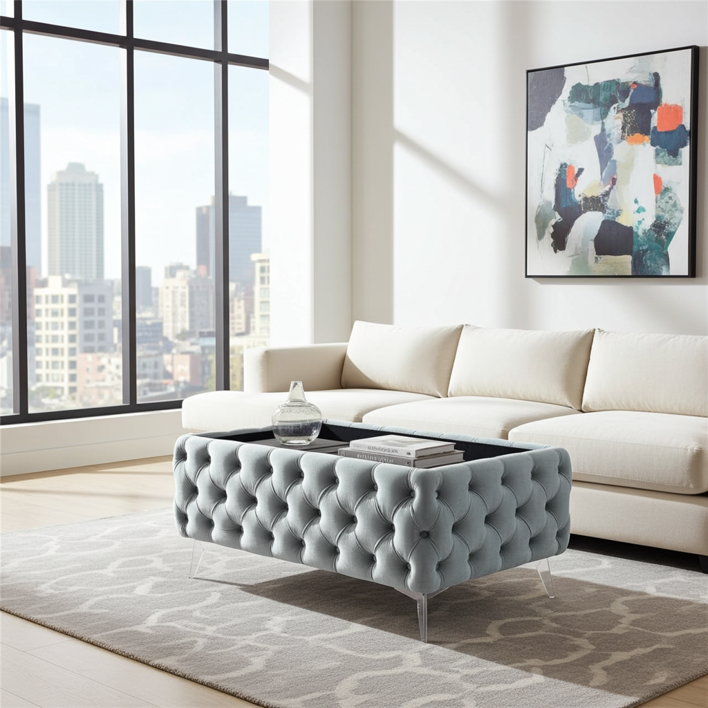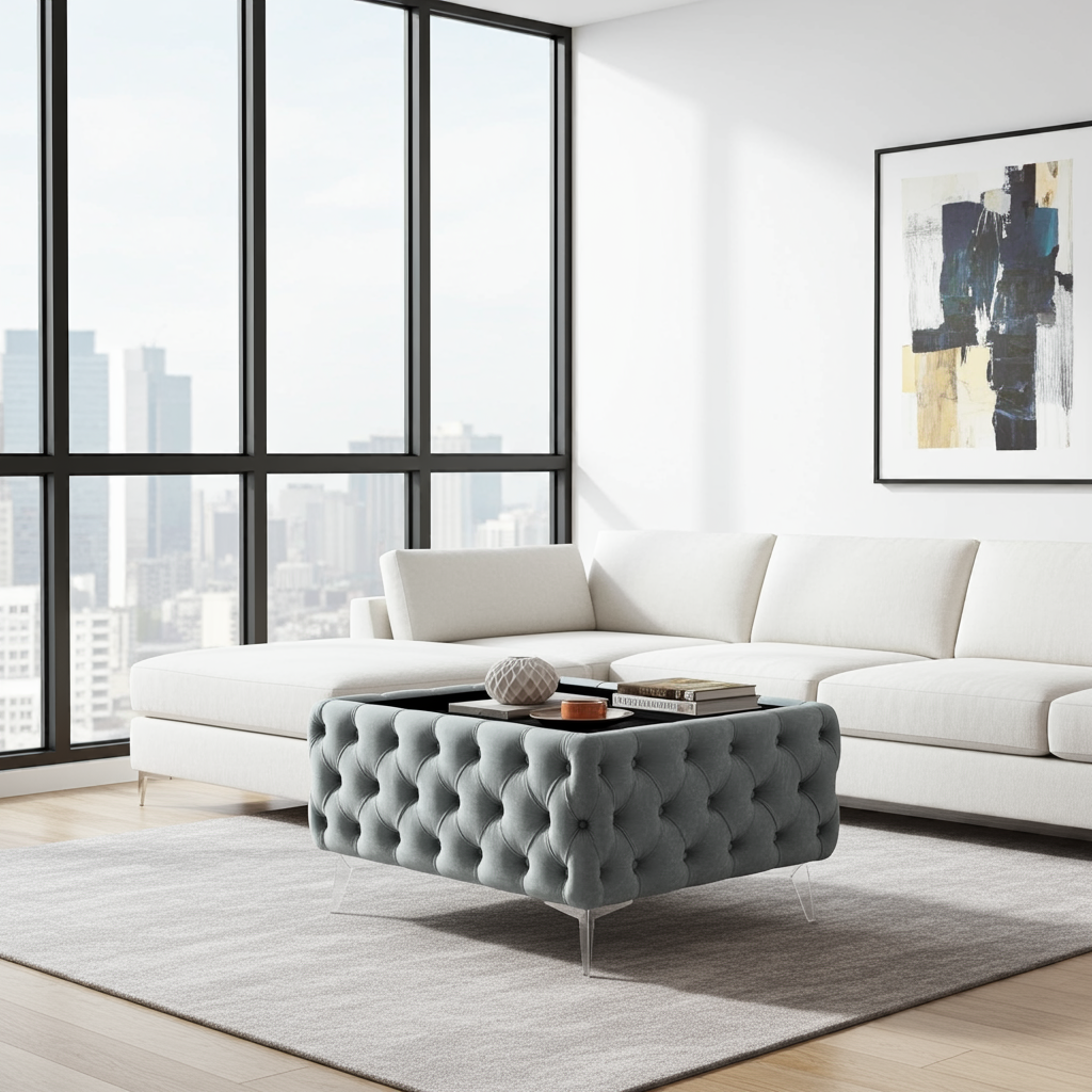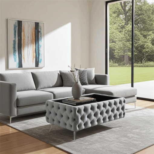This sophisticated coffee table seamlessly blends traditional and contemporary styles. The classic Chesterfield-inspired tufting adds a touch of elegance, while the tinted glass top introduces a modern element. The contrast between the plush velvet upholstery and the sleek glass surface creates a visually striking piece.The table’s solid base ensures stability and longevity without compromising its overall light appearance. Its versatile design makes it suitable for both traditional and modern interiors, adapting effortlessly to various decor styles.For those seeking a personalized touch, the manufacturer offers customization options, including the ability to adjust the table’s dimensions to suit specific requirements.The Chester Lux Coffee Table is an ideal choice for discerning customers who value a harmonious combination of style, quality, and functionality in their furniture. Its elegant design and practical features make it a standout piece for any living space.