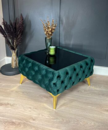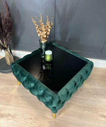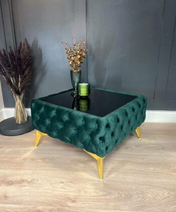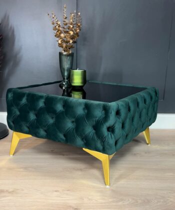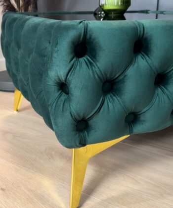 Elegance, style, and functionality in one – the Chester Lux Coffee Table is more than just a coffee table; it’s a statement of luxury in your interior. Upholstered in velvet, tufted premium fabric in Dark Green, it captivates with its refined look and soft texture, adding a touch of coziness to your space. The glass top not only enhances the table’s modern character but also ensures practicality – place your coffee cup, decorations, or favorite magazines on it without worrying about damaging the upholstered surface.