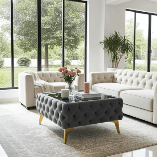 The Chester Lux Dark Grey Coffee Table is the ultimate blend of style and functionality for your living room. Designed with a contemporary square shape, this coffee table features a plush dark grey velvet finish that adds a touch of luxury to any space. Moreover, the sturdy glass top provides a smooth, easy-to-clean surface, ideal for serving drinks or displaying your favorite décor.
