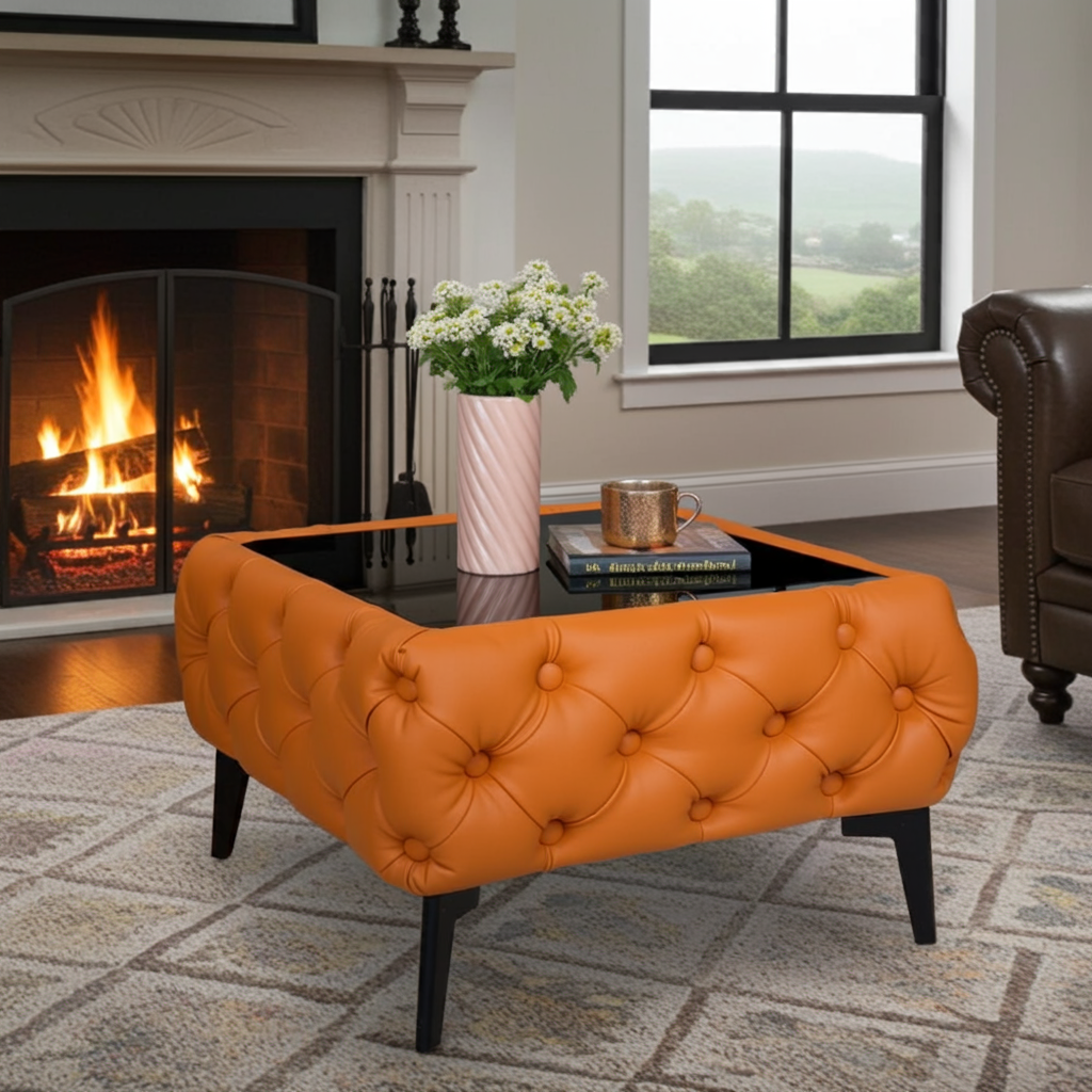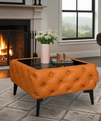 Elegance, style, and functionality in one – the Chester Lux Coffee Table is more than just a coffee table; it’s a statement of luxury in your interior. Upholstered in eco leather, tufted premium fabric in Orange, it captivates with its refined look and soft texture, adding a touch of coziness to your space. The glass top not only enhances the table’s modern character but also ensures practicality – place your coffee cup, decorations, or favorite magazines on it without worrying about damaging the upholstered surface.