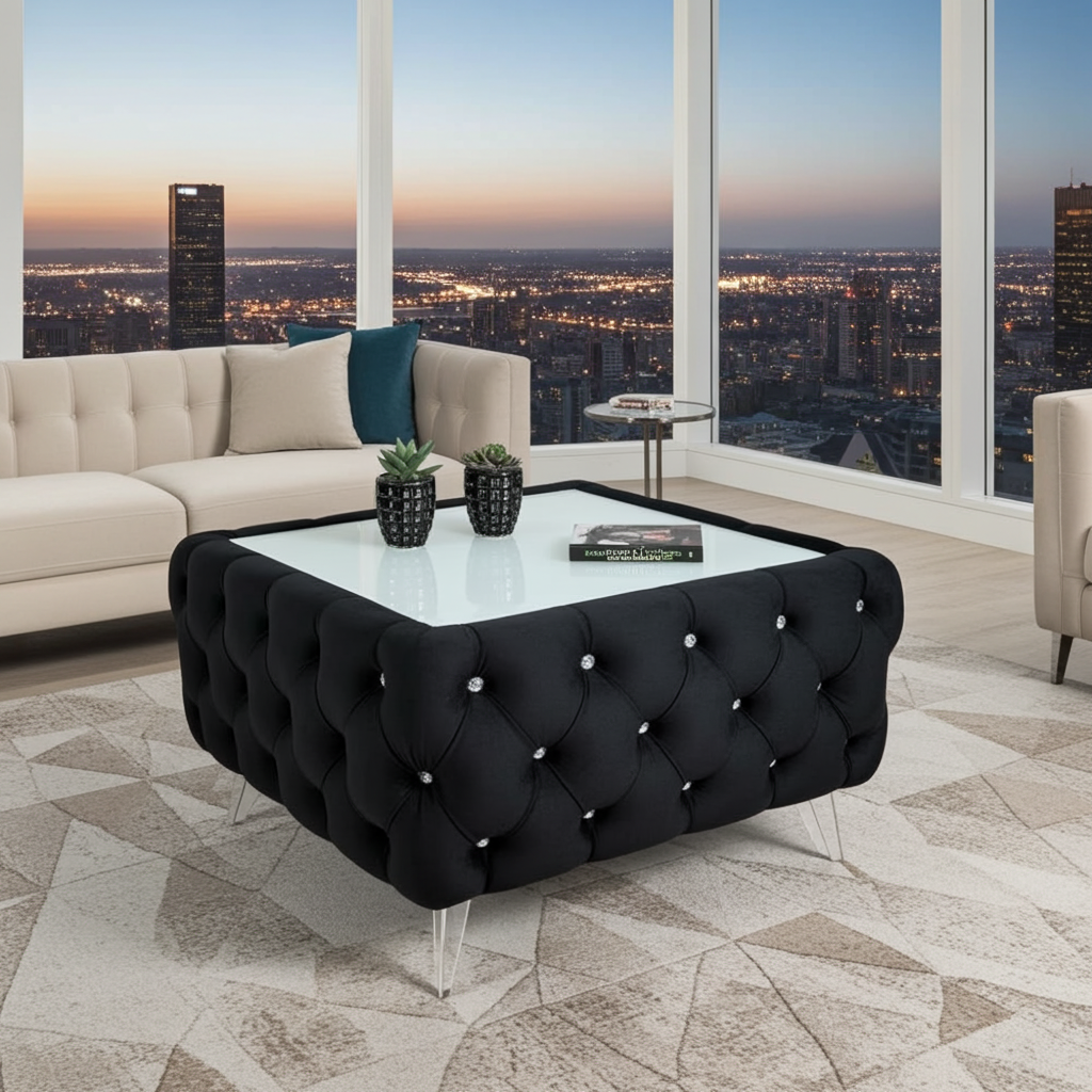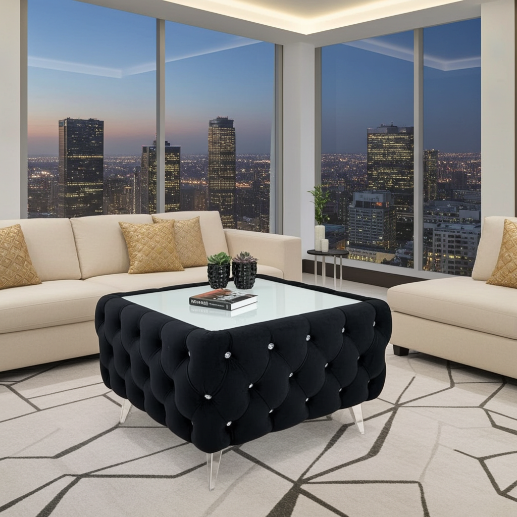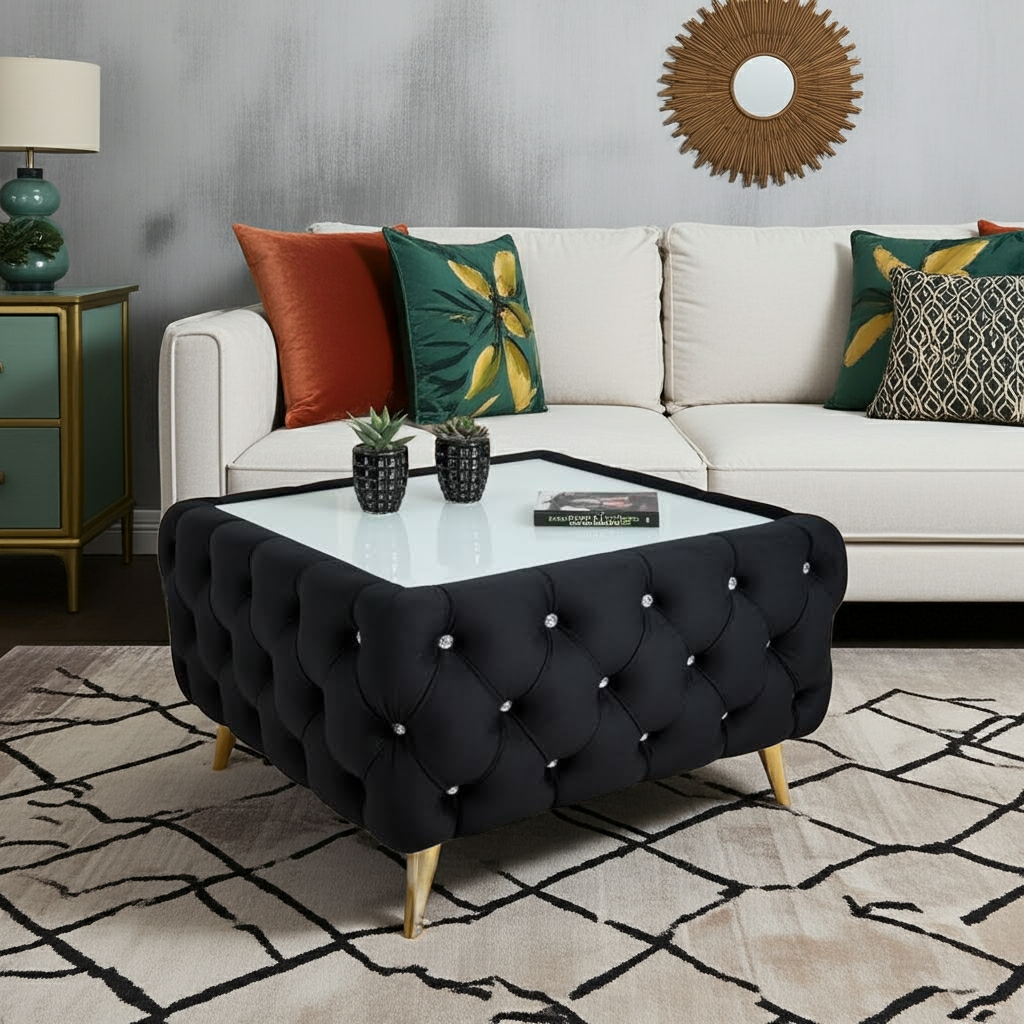 This coffee table showcases meticulous craftsmanship with deep button tufting and premium velvet fabric that maintains its luxurious appearance over time. The sturdy metal legs provide excellent stability while adding a touch of glamour to your space.