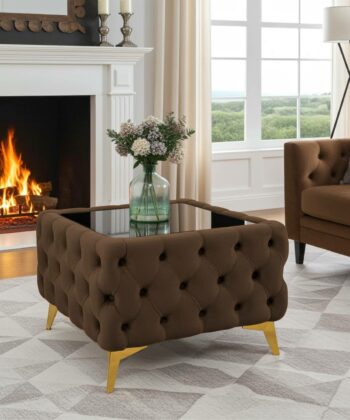 Indulge in a touch of luxury with the Chester Lux Square Brown Coffee Table 63x63x45cm velvet with glass. This coffee table is more than just a piece of furniture; it is a stylish accent that will change your space. It is upholstered in soft, tufted velvet in a rich brown color. This fabric adds warmth and comfort. The glass top adds a modern look and is practical for everyday use. It is perfect for holding your coffee, décor, or magazines.