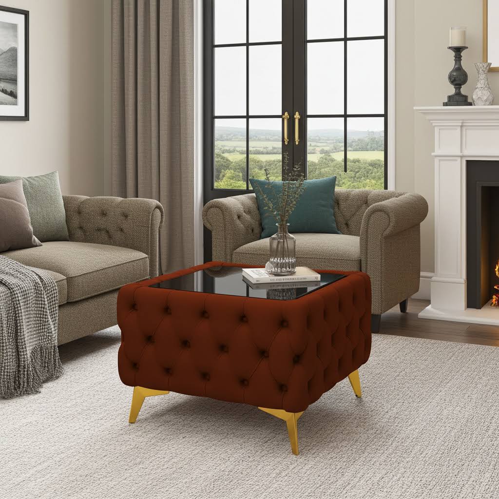 The Chester Lux Square Copper Coffee Table 63x63x45cm velvet with glass is a stunning centerpiece for any living room or lounge. This elegant coffee table features a classic Chesterfield-inspired design with deep tufted velvet upholstery in a rich copper shade. The square shape and 63x63x45cm dimensions make it ideal for both large and small spaces, while the sturdy glass top provides a practical and stylish surface for drinks, books, or décor.