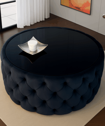 This table is: nesting table, ottoman table, velvet table, Chesterfield upholstered, deep buttoned, living room, coctail table, small table, retro tea table, bedroom table, pouffe with glass, glamour style, pouf table, center table, short table, accent table, vintage.