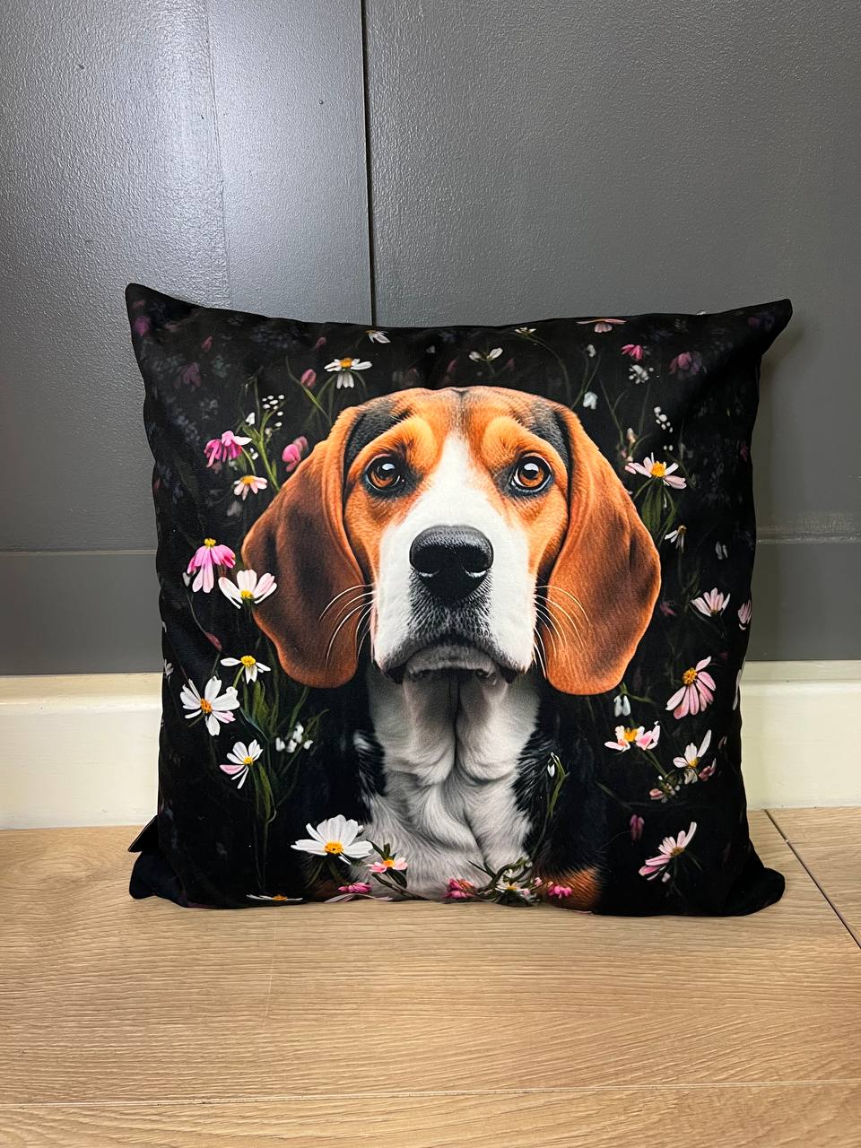 Handcrafted cushion, Beagle dog motif, floral background, decorative pillow, dog lover gift, realistic print, soft fabric, 45×45 cm, sofa accent, stylish home decor, unique gift, machine washable, zipper closure, pre-filled, durable, artisan made, pet portrait, Irish interiors, luxury cushion, easy care, statement piece
