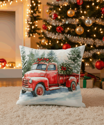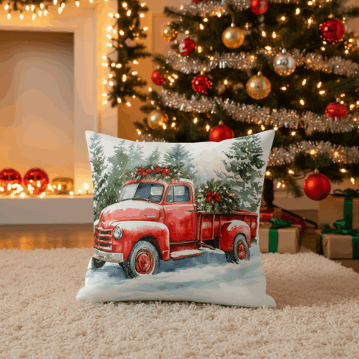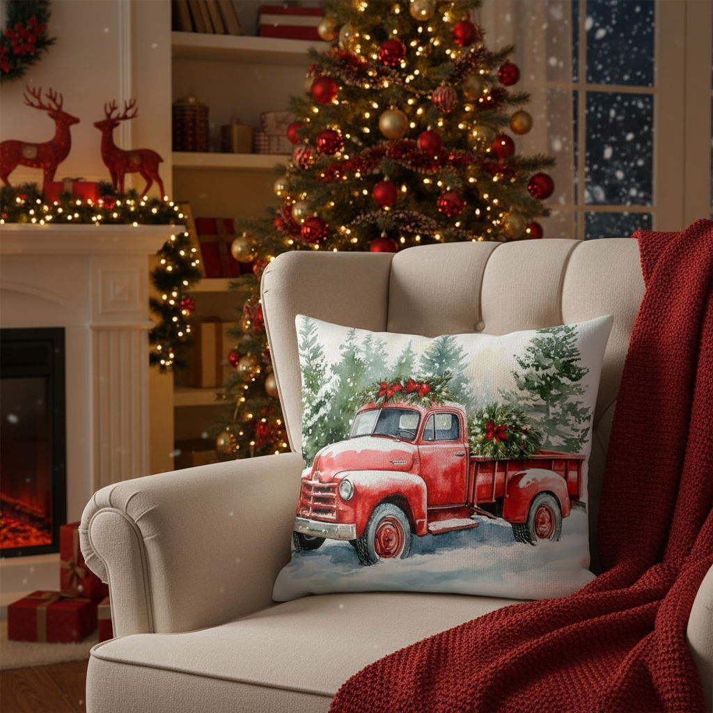Bring the magic of the season into your home with this beautifully handcrafted Christmas pillow. The centerpiece is a classic red vintage truck piled high with holiday greenery, set against a backdrop of snowy pine trees. This vibrant, painterly design radiates festive cheer and nostalgic warmth—making it a memorable and heartwarming addition to any holiday interior.