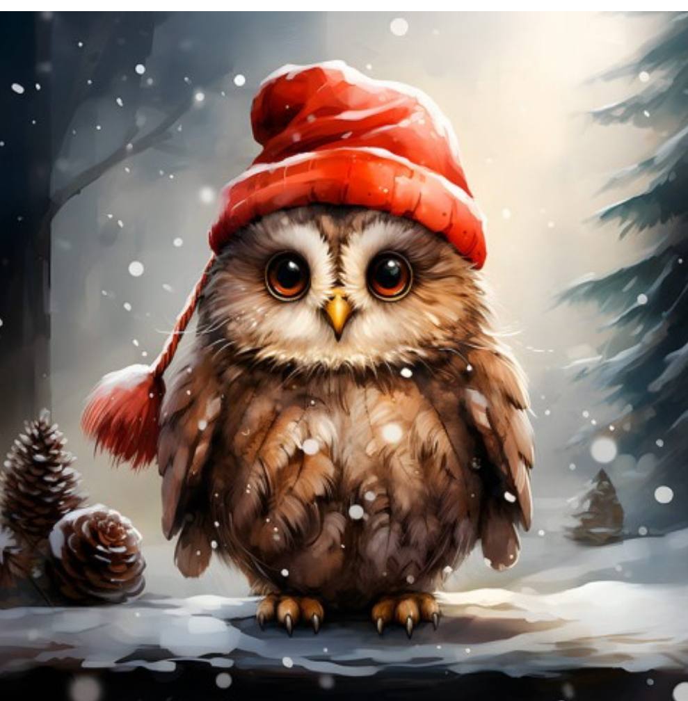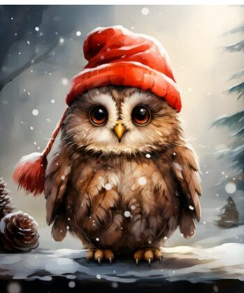 • Design: Adorable baby owl in a red winter hat, set in a snowy forest