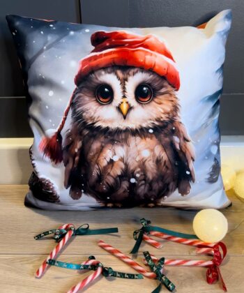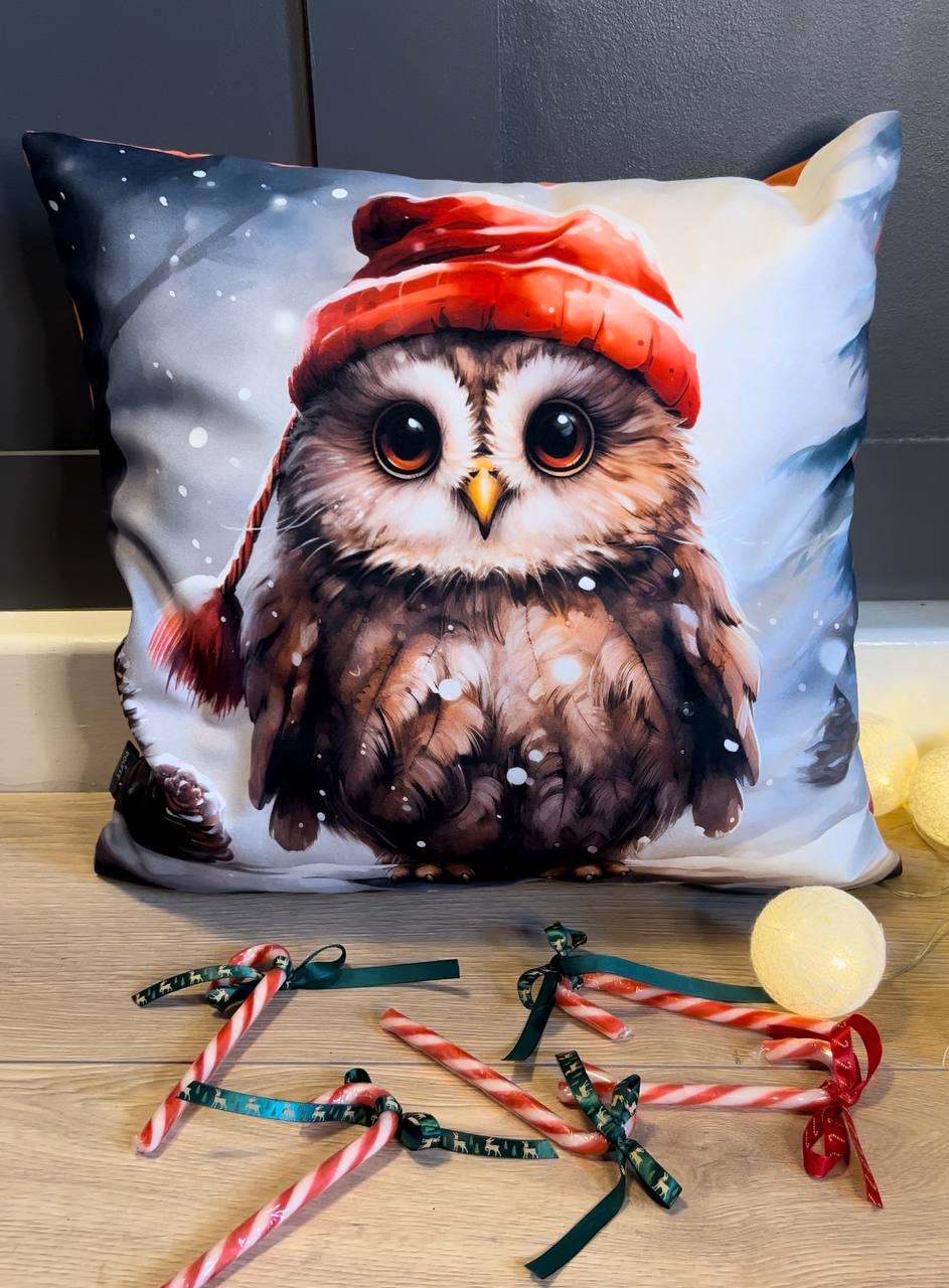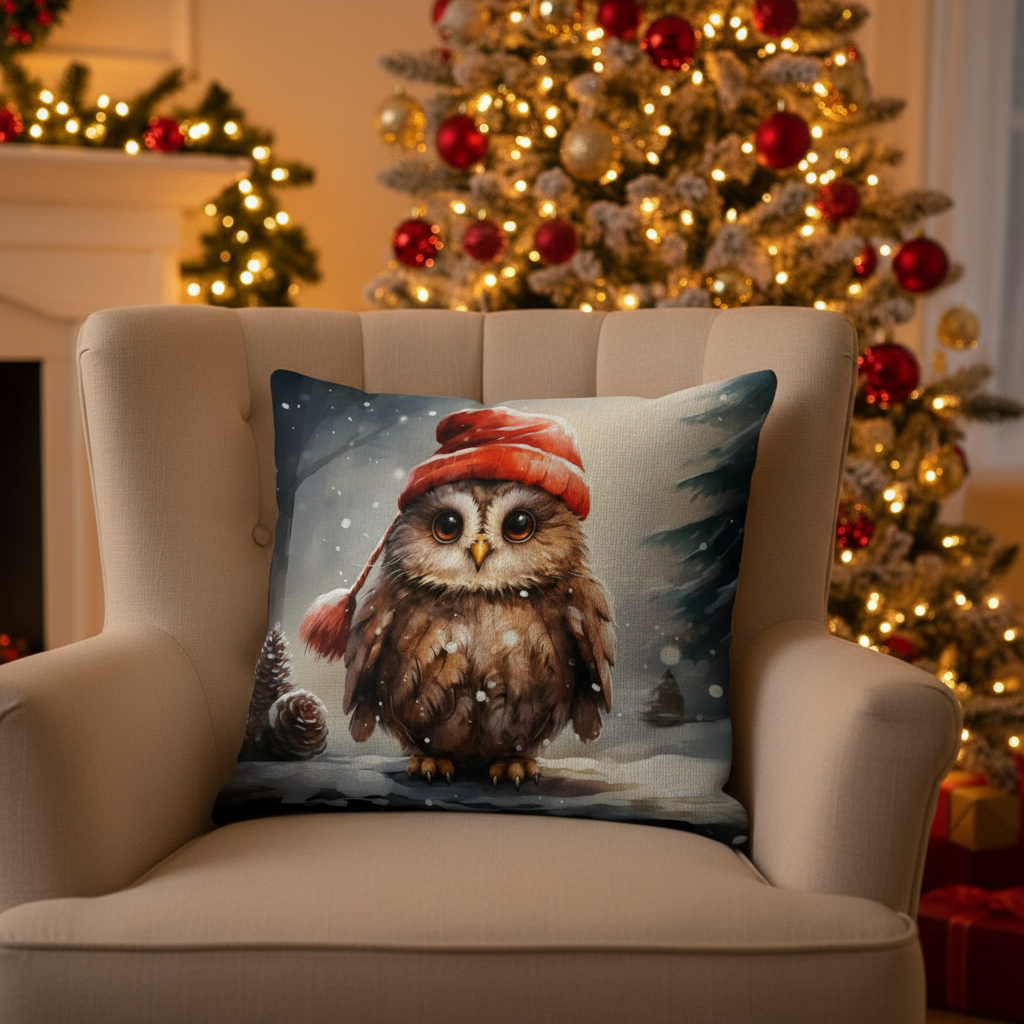 Bring a touch of woodland magic to your holiday décor with this handcrafted Christmas pillow. It features an adorable owl in a red winter hat and is made from premium, soft fabric.