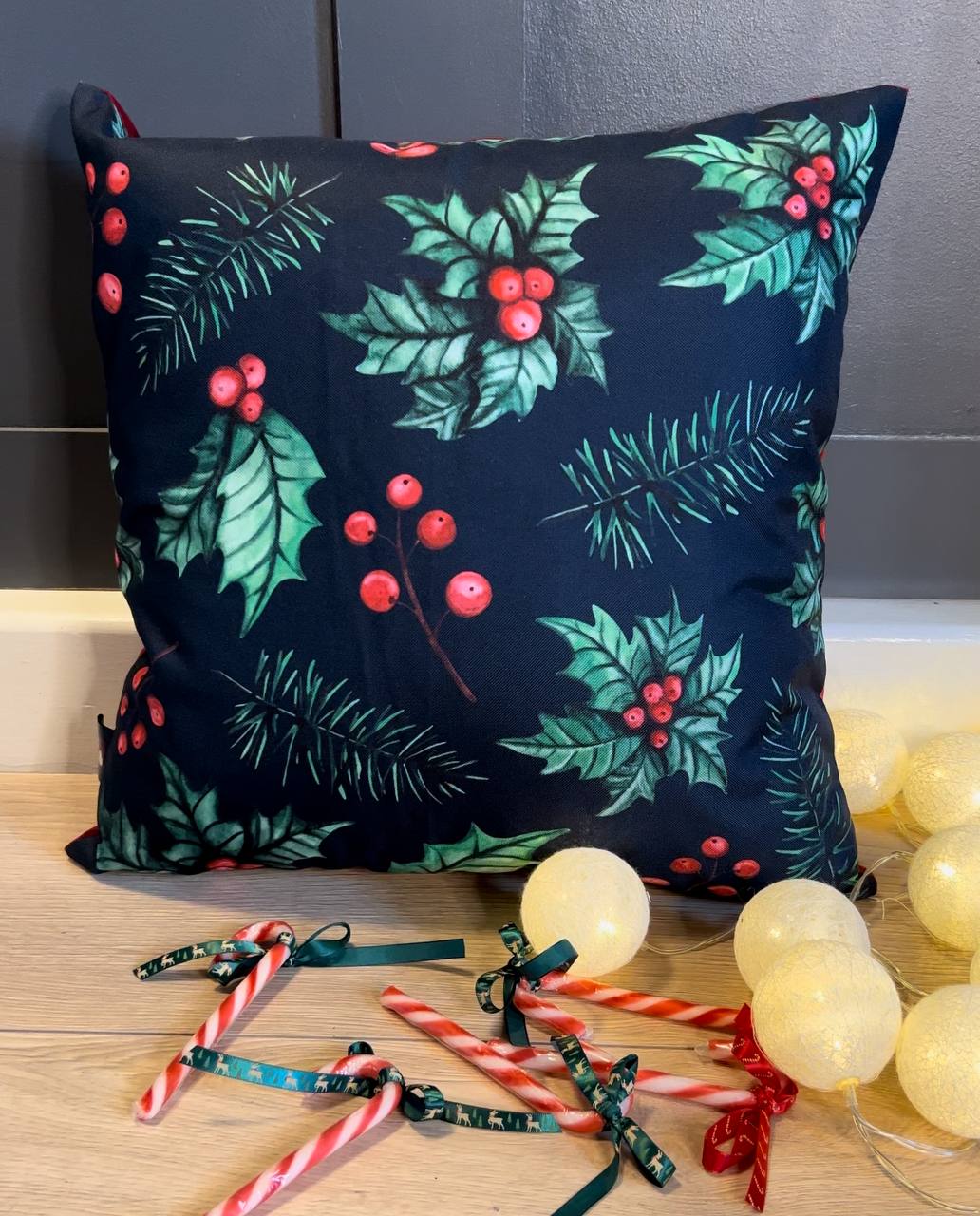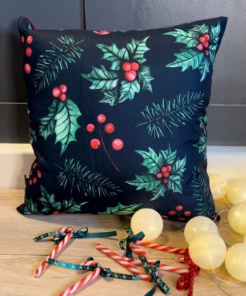First and foremost, embrace the timeless beauty of the holiday season with this stunning handcrafted Christmas pillow. It features a rich, classic pattern of vibrant green holly leaves, bright red berries, and delicate pine branches set against a deep, dark background. Furthermore, this elegant and traditional design is perfect for adding a touch of sophistication and festive charm to any room.