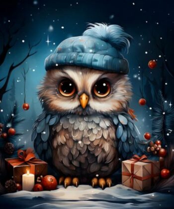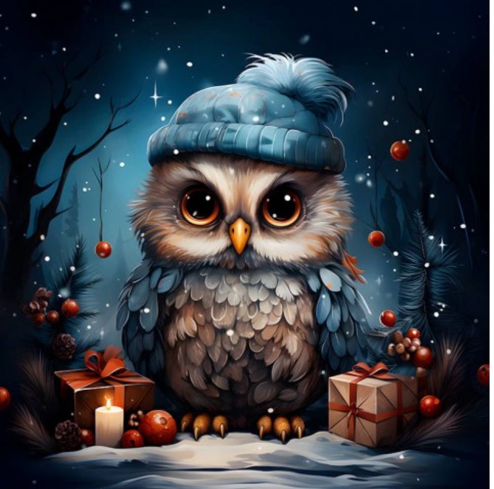 First and foremost, bring a touch of woodland enchantment to your holiday décor with this captivating handcrafted Christmas pillow. The design features an adorable, wide-eyed baby owl wearing a cosy blue winter hat, surrounded by beautifully wrapped gifts in a magical, snowy forest at night. Furthermore, the deep blue tones and warm, glowing light create a truly mesmerising and festive scene.