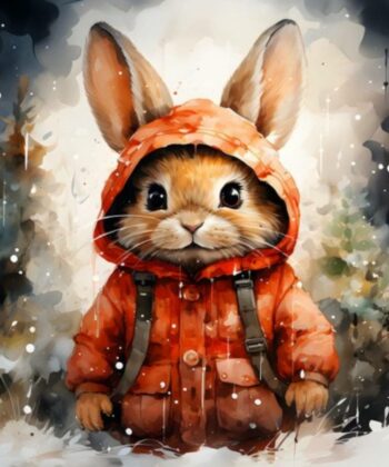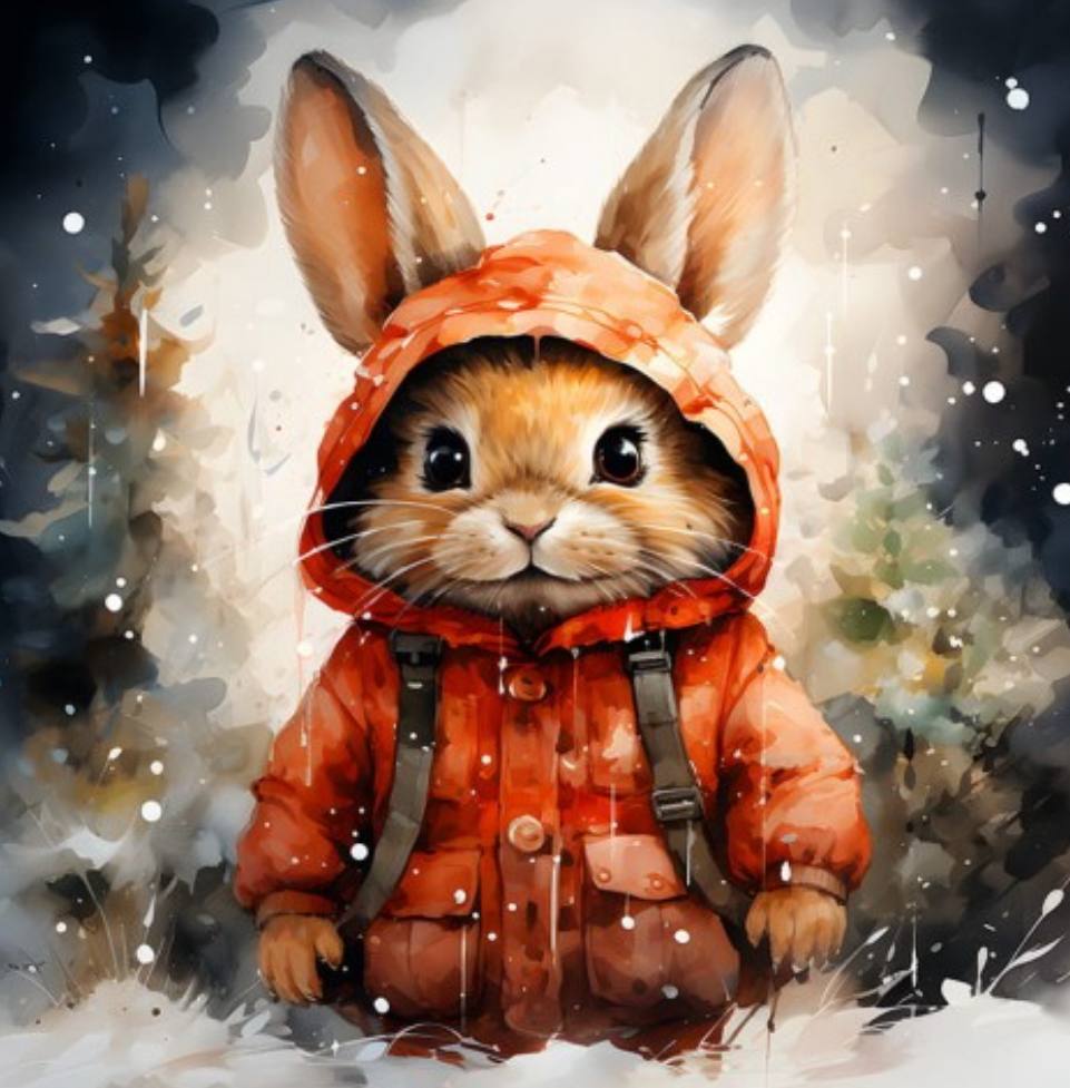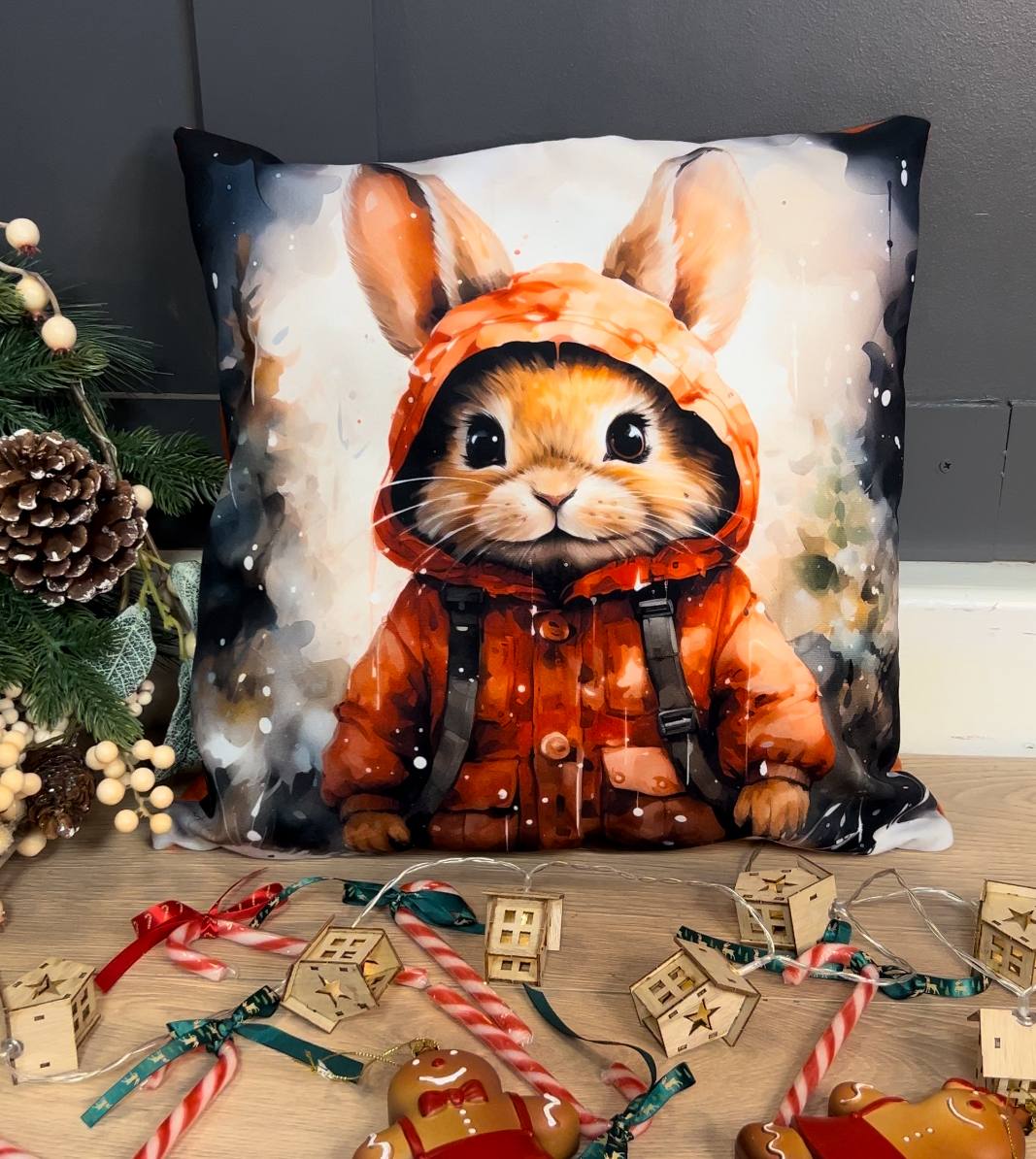 Ignite your holiday decor with a sense of adventure and charm with this captivating handcrafted Christmas pillow. The design features an adorable, wide-eyed bunny ready for a winter expedition, dressed in a bright red hooded coat and equipped with a tiny backpack. Rendered in a beautiful, artistic watercolour style against a softly blurred, snowy background, this pillow brings a storybook feel to any sofa, armchair, or bed.