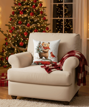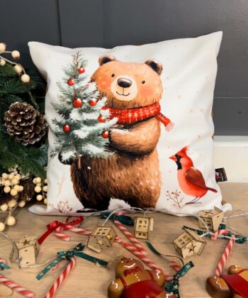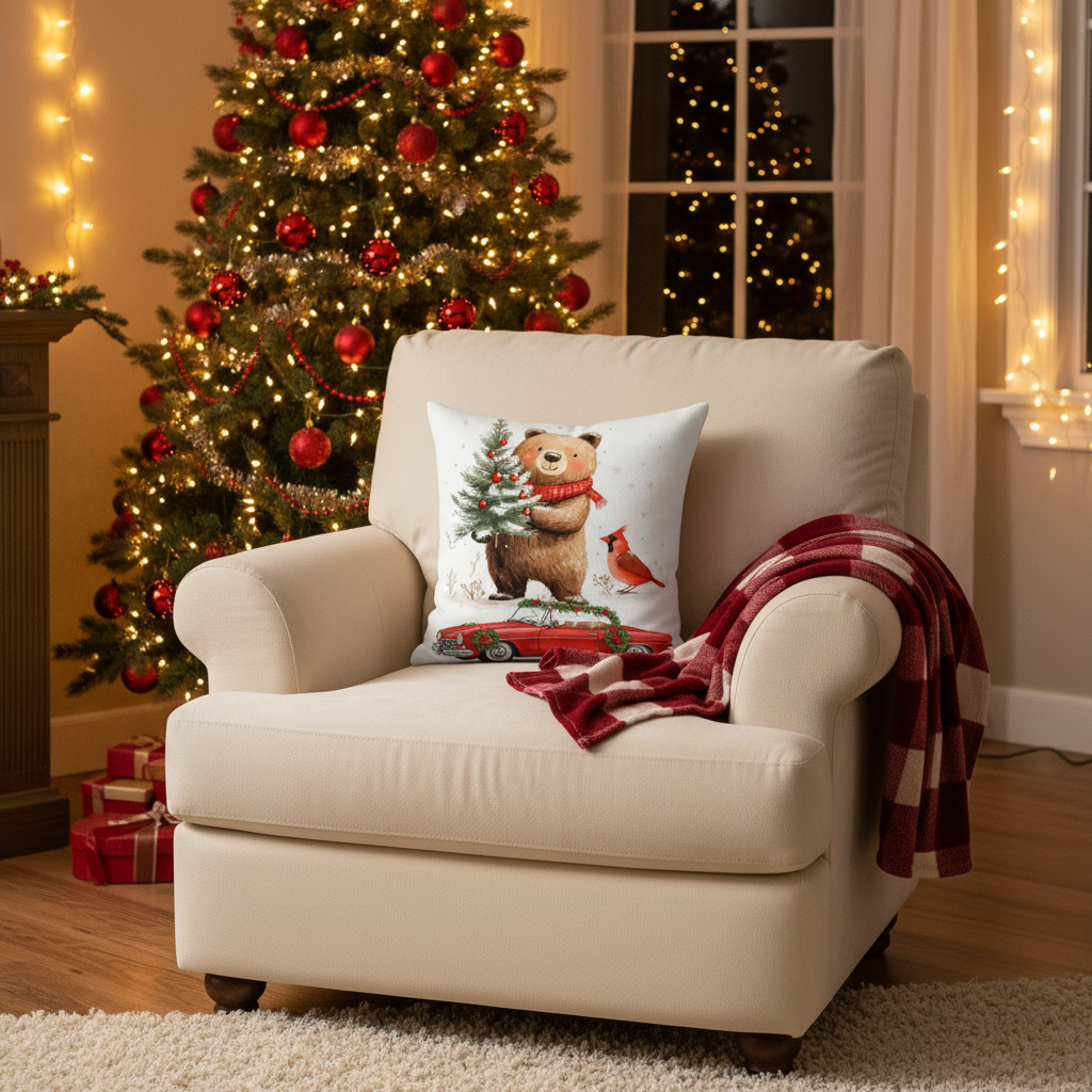 Bring a heartwarming and whimsical touch to your holiday decor with this beautifully handcrafted Christmas pillow. The design features a charming, friendly bear wearing a festive red scarf, proudly holding a small Christmas tree adorned with red ornaments. A cheerful red cardinal perches nearby, completing the idyllic winter scene. Set against a clean white background with delicate snowflakes, this pillow adds a cozy and joyful feel to any sofa, armchair, or bed.pouffelove