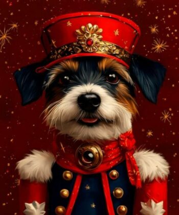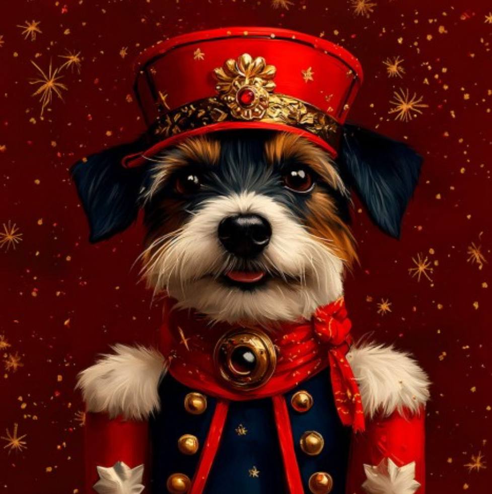 Add a touch of playful sophistication to your holiday décor with this one-of-a-kind handcrafted Christmas pillow. The design features a charming portrait of an adorable dog dressed in a festive, red military-style uniform and hat, set against a rich, star-studded burgundy background. This unique and heartwarming design is perfect for bringing a joyful and distinguished feel to any sofa, armchair, or bed during the festive season, especially for dog lovers.
