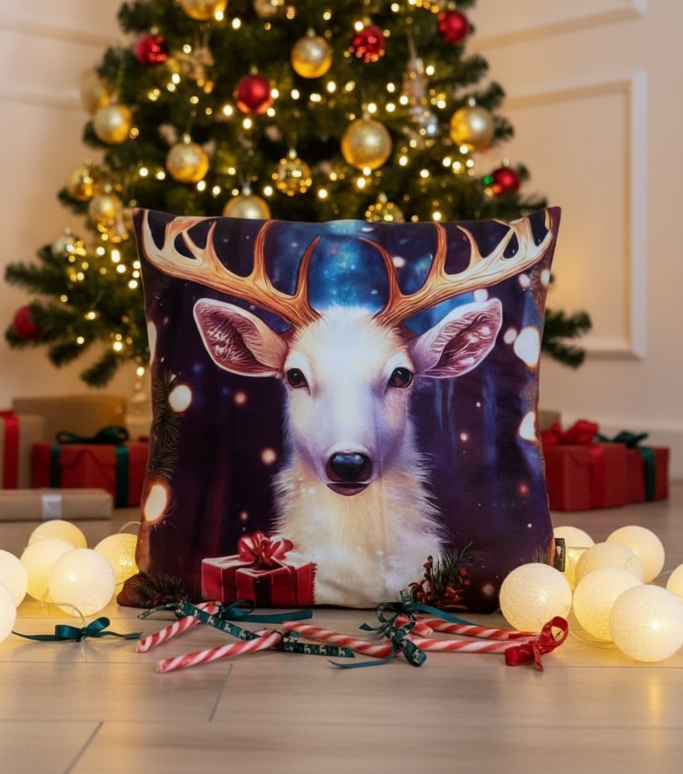 Transform your home into a winter wonderland with this breathtaking handcrafted Christmas pillow. The design features a stunning, majestic white reindeer with magnificent antlers, set against an enchanting, mystical forest backdrop illuminated by a magical blue and purple glow. A small, festively wrapped gift sits at the reindeer’s chest, adding to the sense of holiday magic and wonder. This captivating design is perfect for creating a sophisticated and magical atmosphere on any sofa, armchair, or bed.