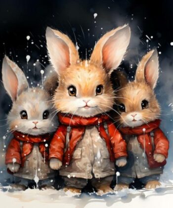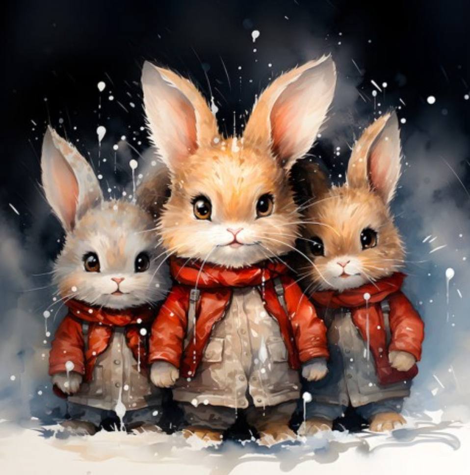 Design: Three illustrated bunnies in winter attire