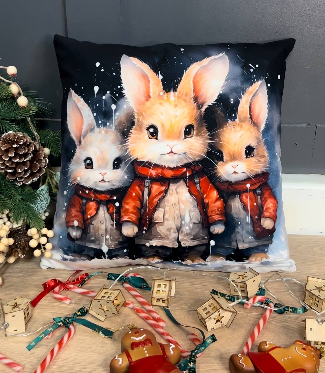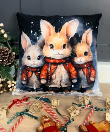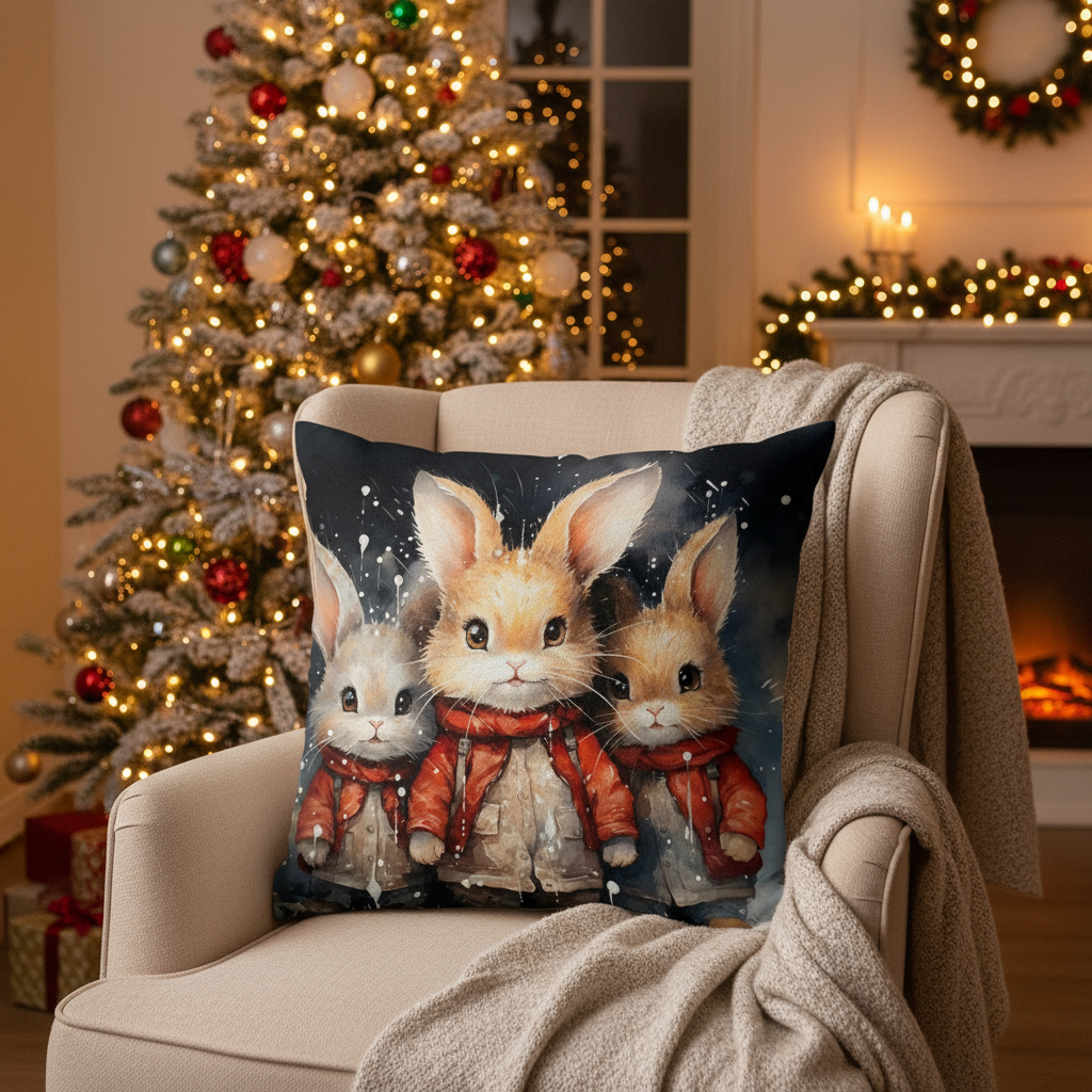 First and foremost, capture the magic of the season with this enchanting handcrafted Christmas pillow. It features a beautifully detailed illustration of three adorable bunnies bundled up in cosy red winter coats against a snowy backdrop. This charming design is perfect for adding a whimsical and heartwarming feel to any sofa, armchair, or bed during the festive period.