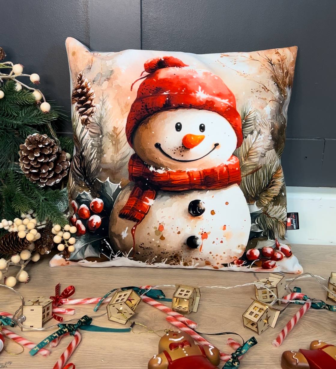 Brighten your home this season with our handcrafted Christmas pillow featuring an irresistibly joyful snowman in a cosy red hat and scarf. The vibrant, painterly design is surrounded by pine branches, berries, and wintry accents—making it a heartwarming focal point for any festive interior.