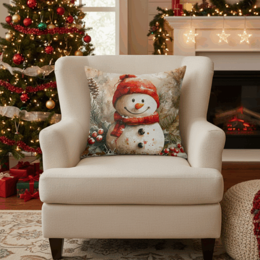Brighten your home this season with our handcrafted Christmas pillow featuring an irresistibly joyful snowman in a cosy red hat and scarf. The vibrant, painterly design is surrounded by pine branches, berries, and wintry accents—making it a heartwarming focal point for any festive interior.