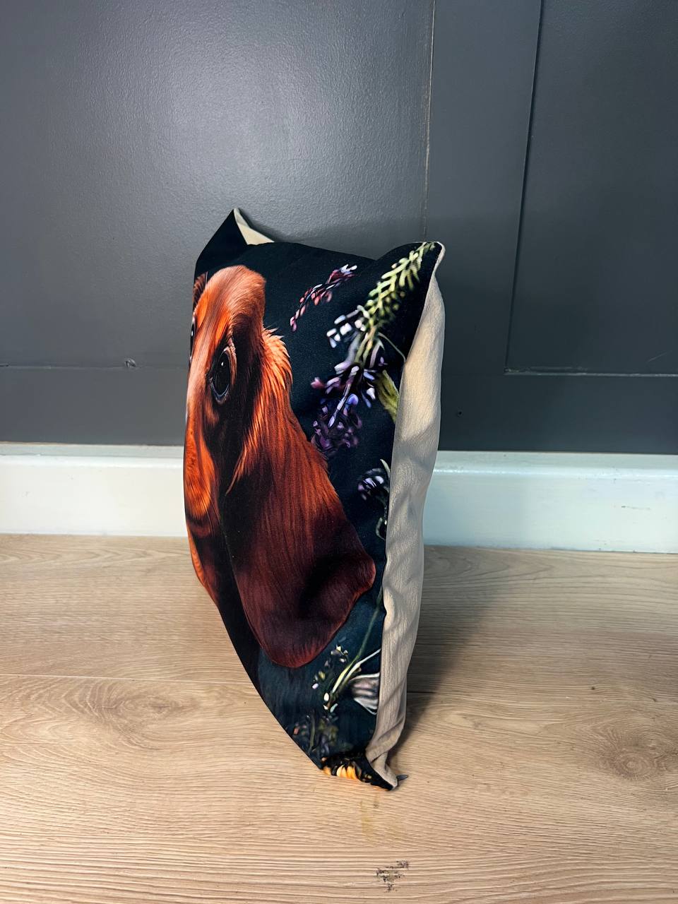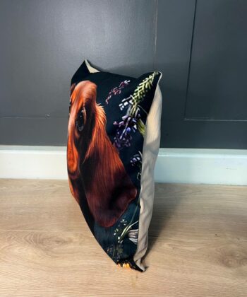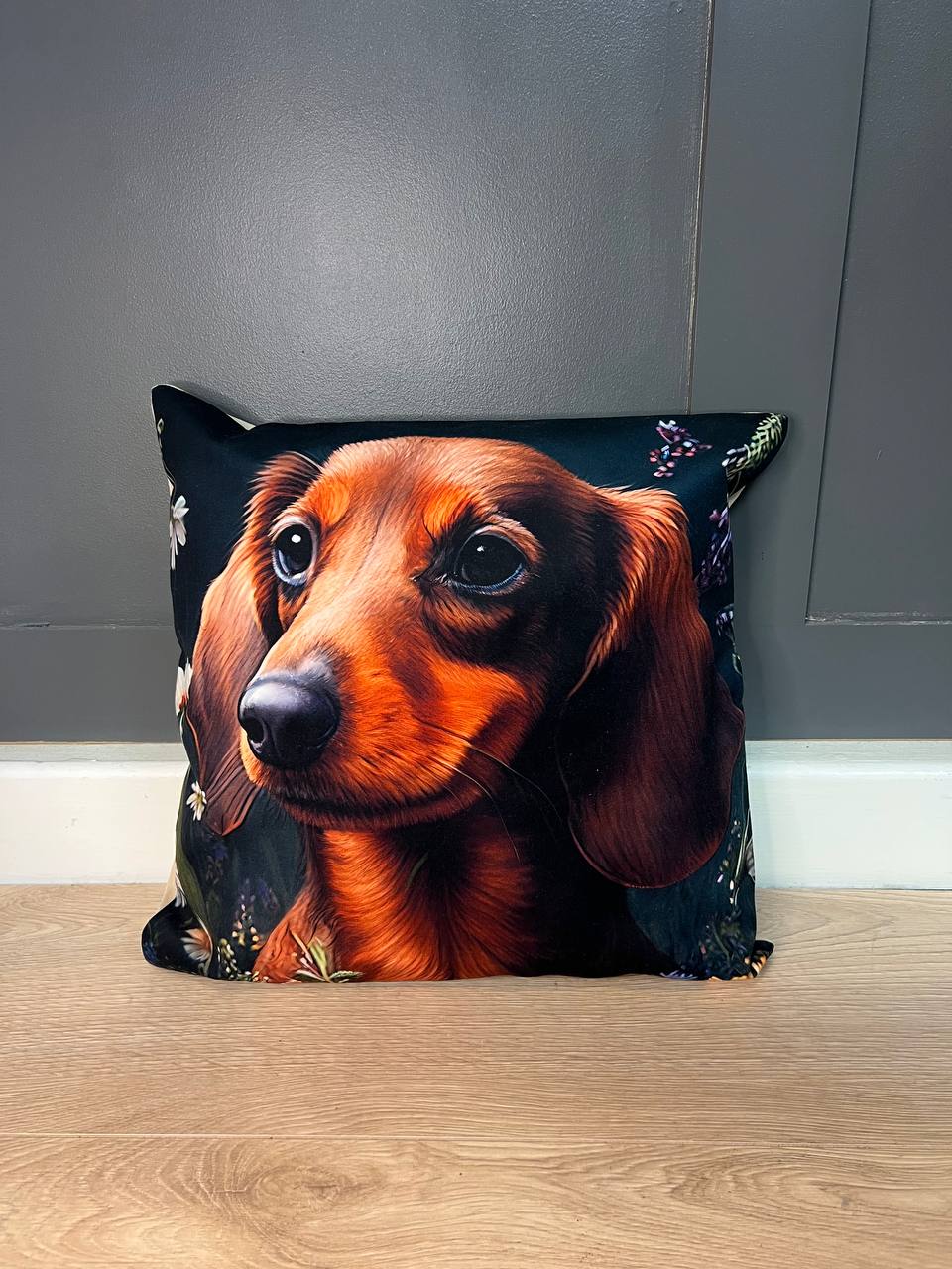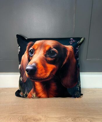 Transform your home décor with this handcrafted cushion showcasing a beautifully detailed dachshund (sausage dog) portrait set against a subtle floral background. Because of its realistic dog motif and artistic design, this cushion adds warmth, personality, and a touch of whimsy to any sofa, armchair, or bed. Whether you’re a dachshund enthusiast or simply want to introduce a unique accent, this cushion is a perfect fit for modern Irish interiors.
