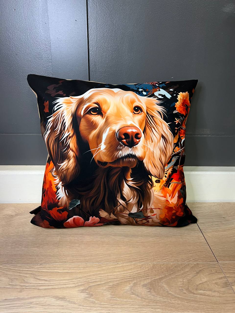 Handcrafted cushion, Golden Retriever dog motif, floral background, decorative pillow, dog lover gift, realistic print, soft fabric, 45×45 cm, sofa accent, stylish home decor, unique gift, machine washable, zipper closure, pre-filled, durable, artisan made, pet portrait, Irish interiors, luxury cushion, easy care, statement piece