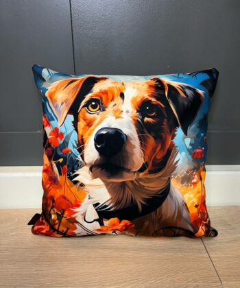 Brighten your interior with this handcrafted cushion showcasing a lifelike Jack Russell Terrier surrounded by vivid orange and red blooms. The energetic dog motif and bold floral background create a cheerful, eye-catching accent for any sofa, armchair, or bed. Whether you’re a Jack Russell enthusiast or want to introduce a playful, pet-inspired detail, this cushion is perfect for modern Irish homes.