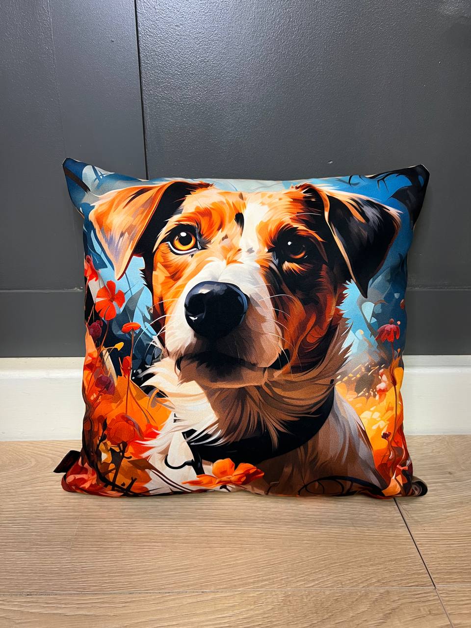 Add Vibrant Character to Your Home with a Handcrafted Cushion Featuring a Jack Russell Terrier and Colourful Flowers