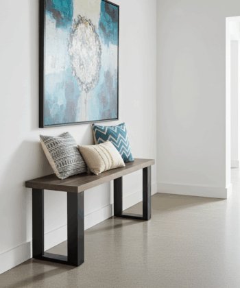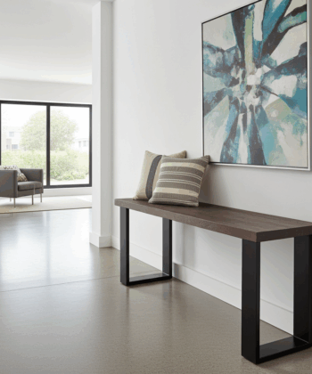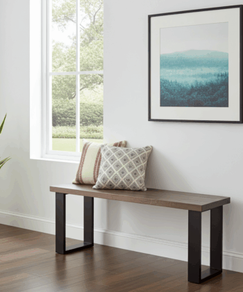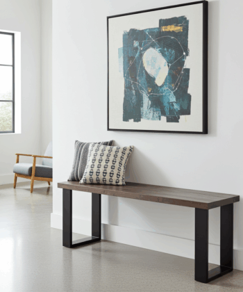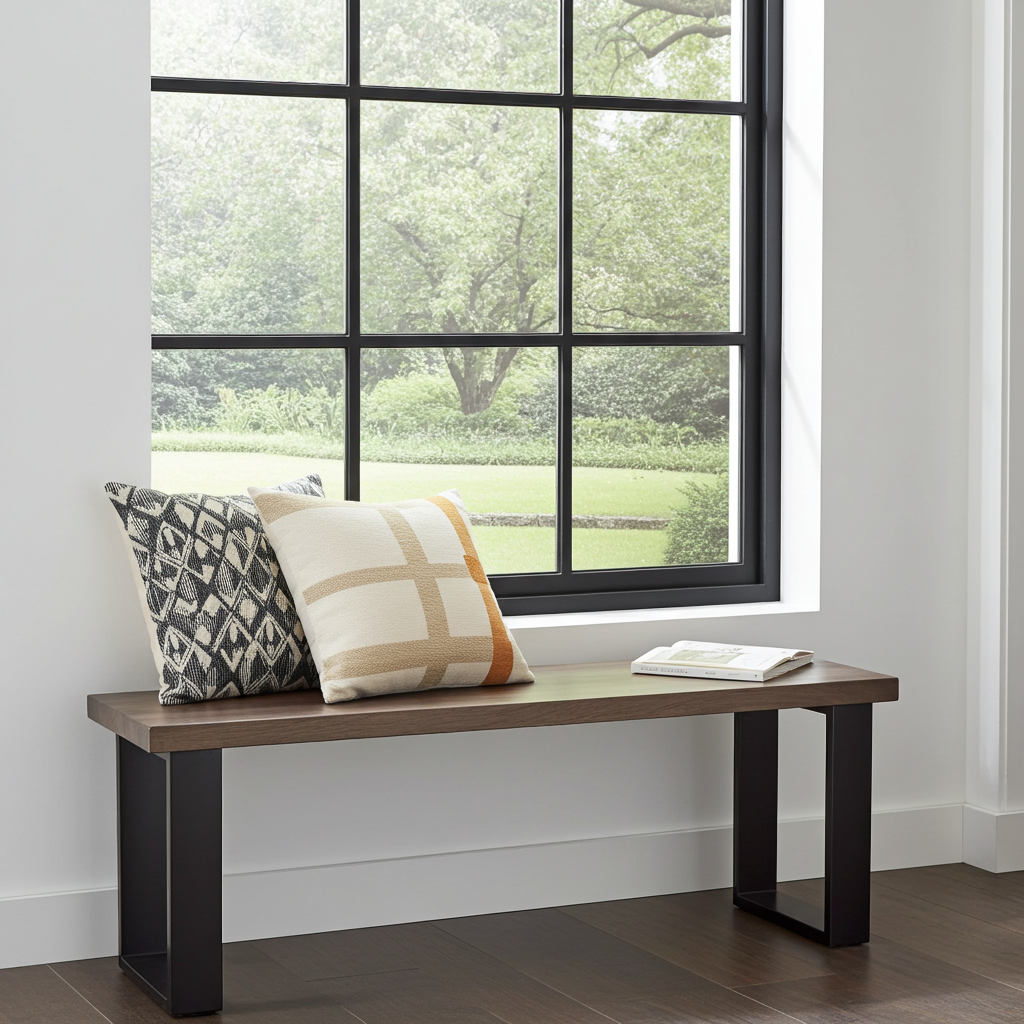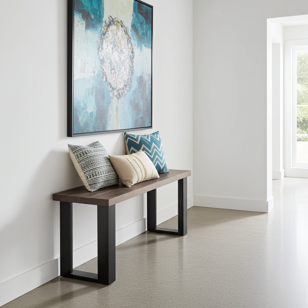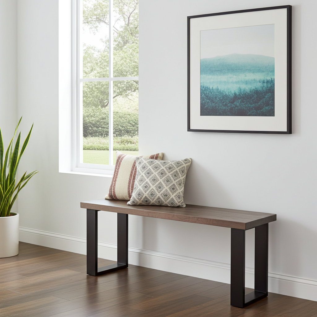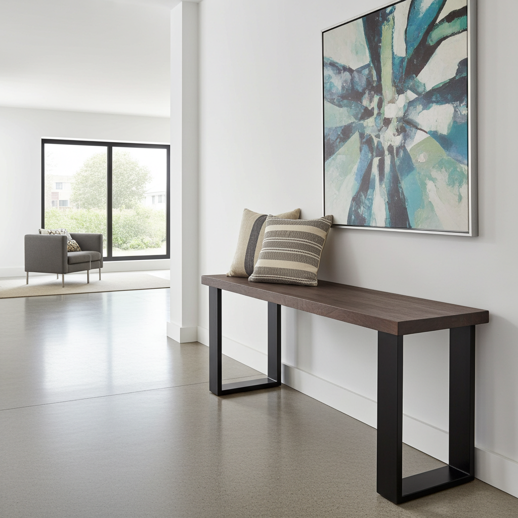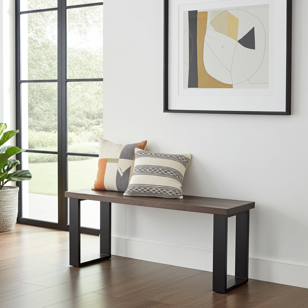 Transform your entryway with this sophisticated wooden bench featuring a beautifully lacquered dark walnut top and robust black metal frame. Additionally, this exceptional piece showcases premium wood grain patterns enhanced by professional lacquer finishing. Moreover, it’s expertly crafted for contemporary Irish interiors. Furthermore, the sleek black powder-coated metal legs provide industrial elegance and exceptional durability in any environment.