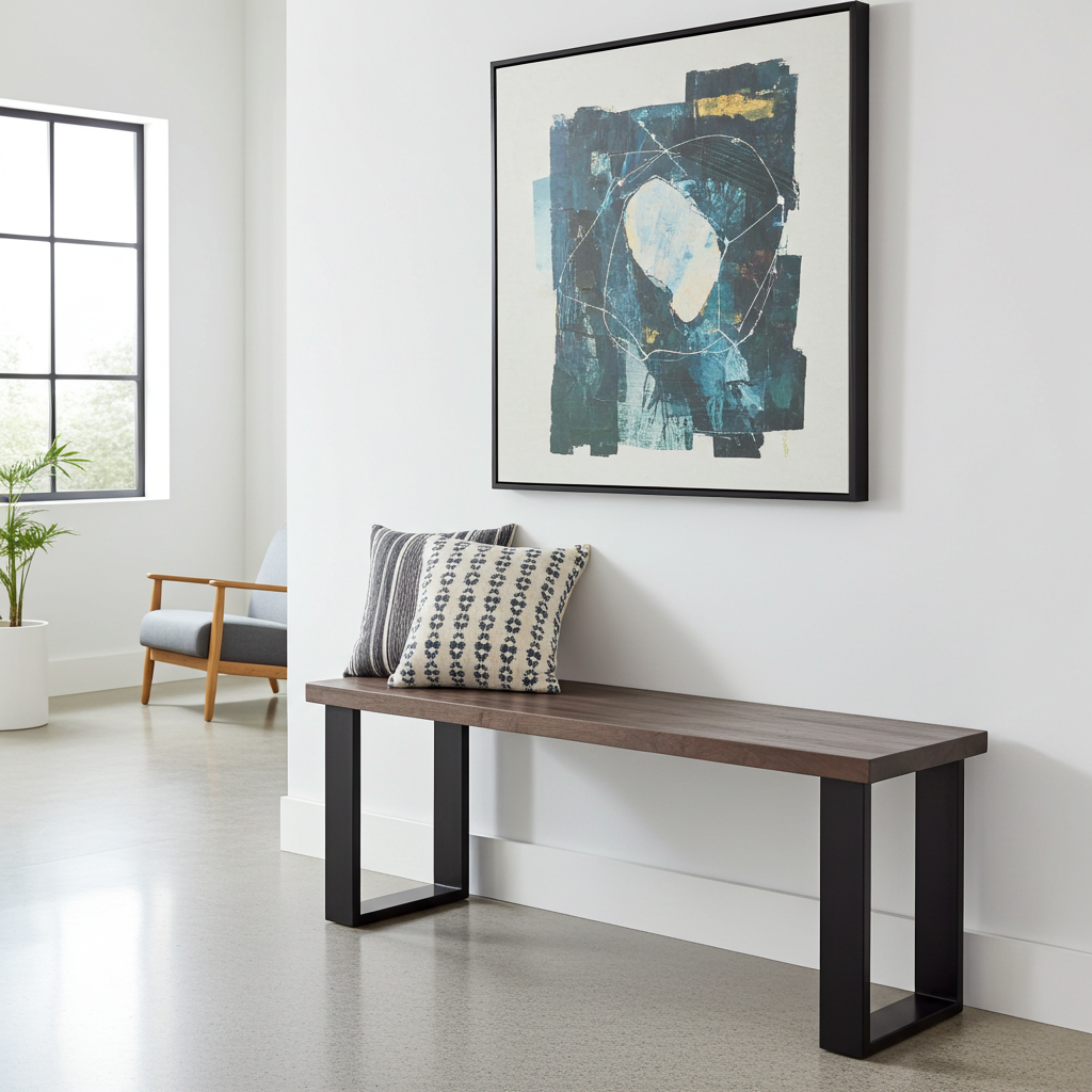 Premium Handcrafted Wooden Bench with Lacquered Walnut Top and Powder-Coated Black Metal Legs for Irish Homes