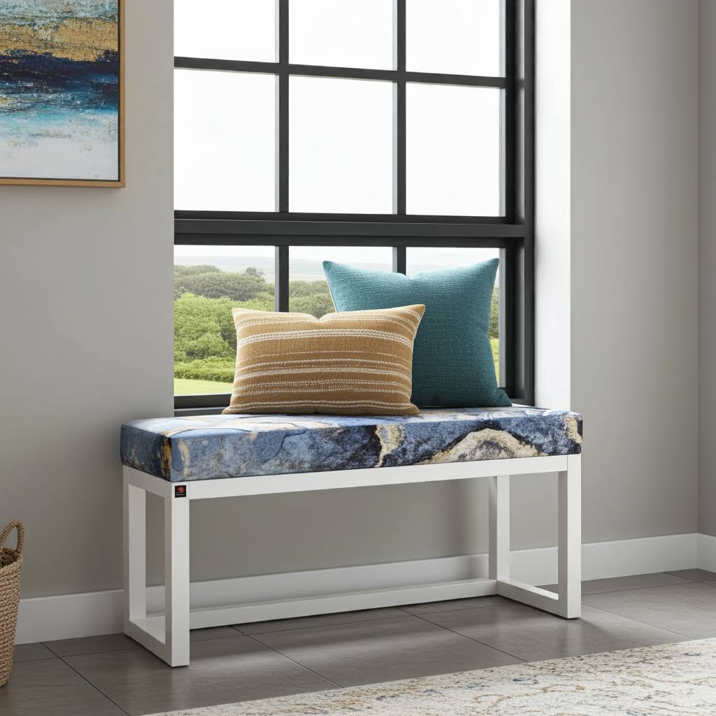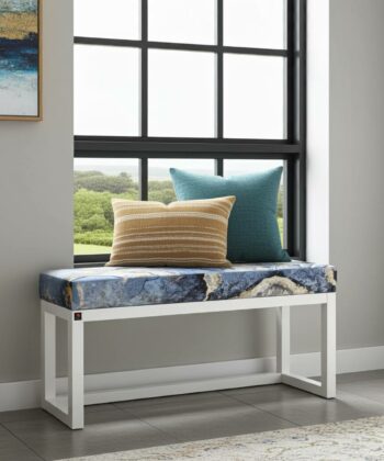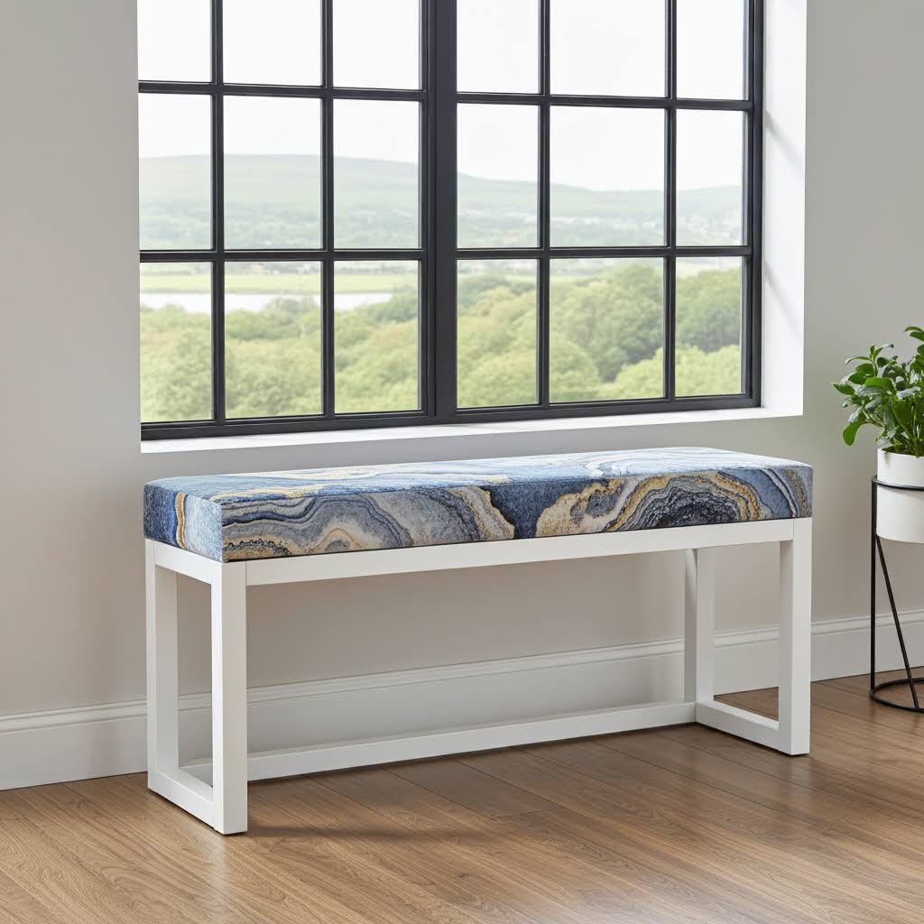 Blue paisley wooden bench with white alder frame. Premium handcrafted furniture perfect for contemporary Irish homes celebrating artistic pattern design.
