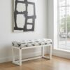 This enchanting wooden bench brings countryside charm indoors through its delightful cream velvet upholstery featuring elegant deer silhouettes beautifully complemented by a pristine white alder wood frame. The charming woodland design features graceful stag motifs against a soft cream background that creates an atmosphere of rustic sophistication while the clean white wooden structure adds Scandinavian elegance to any interior space.