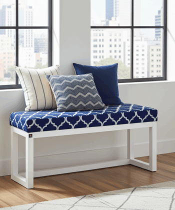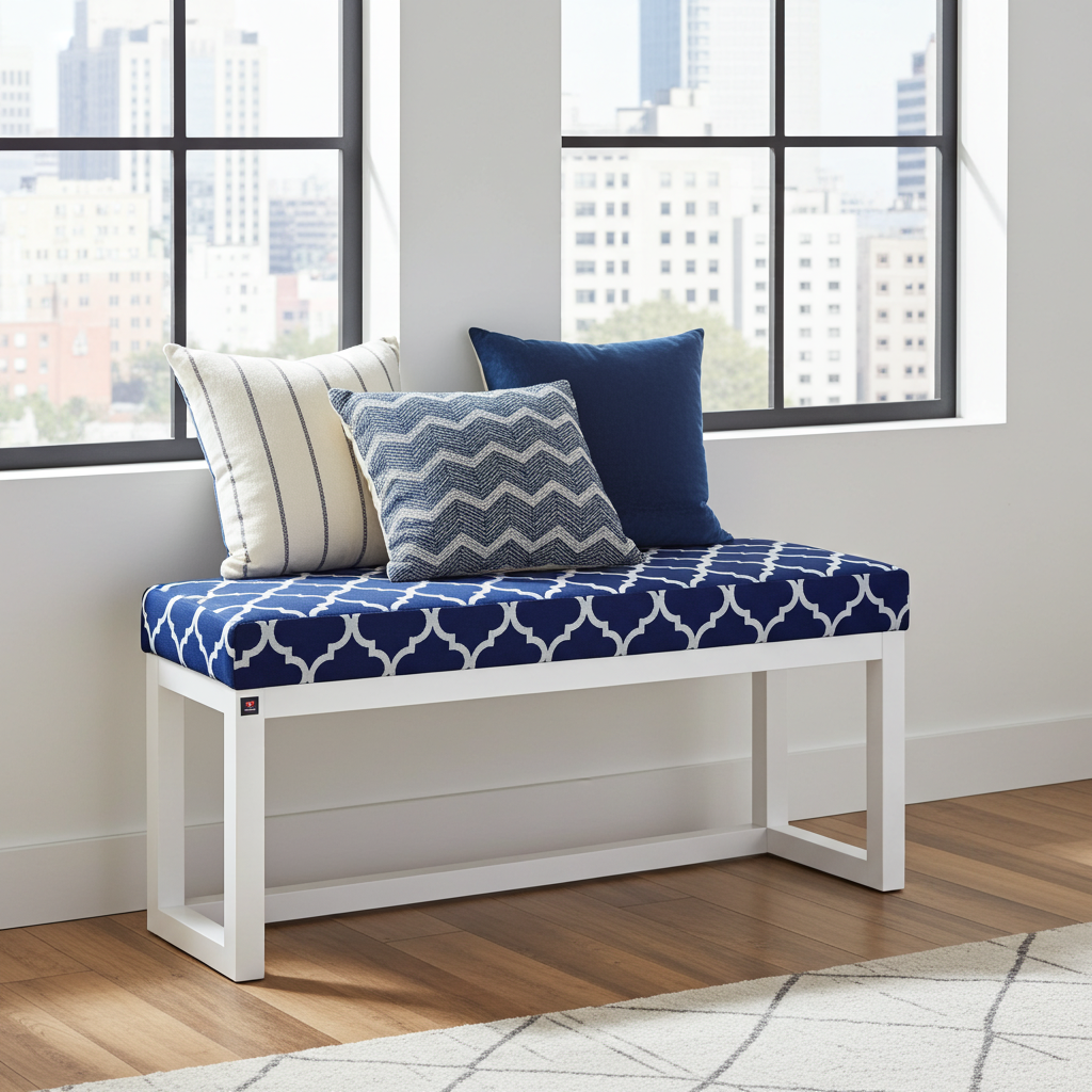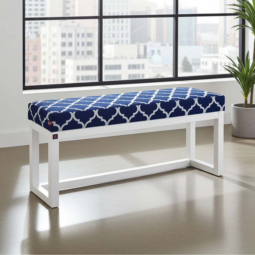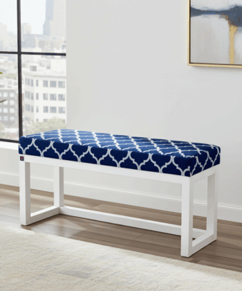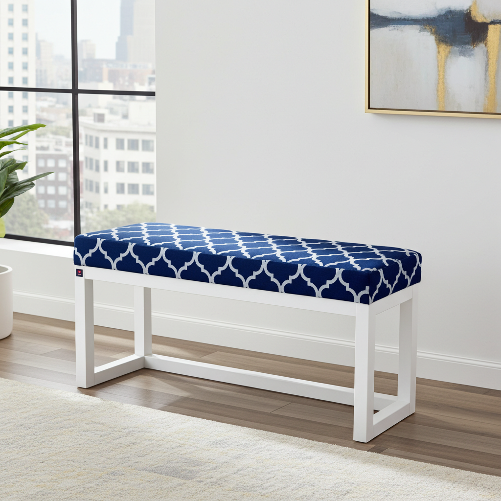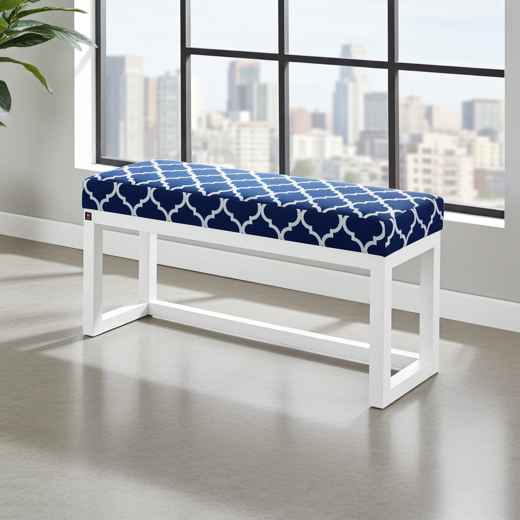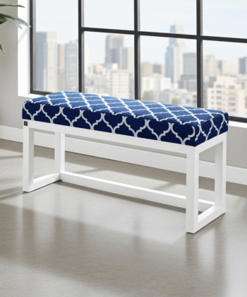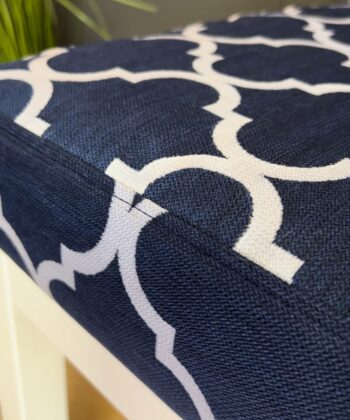 Premium Handcrafted Wooden Bench Featuring Navy Blue Geometric Pattern Velvet with White Alder Wood Frame – Contemporary Elegance for Modern Irish Homes