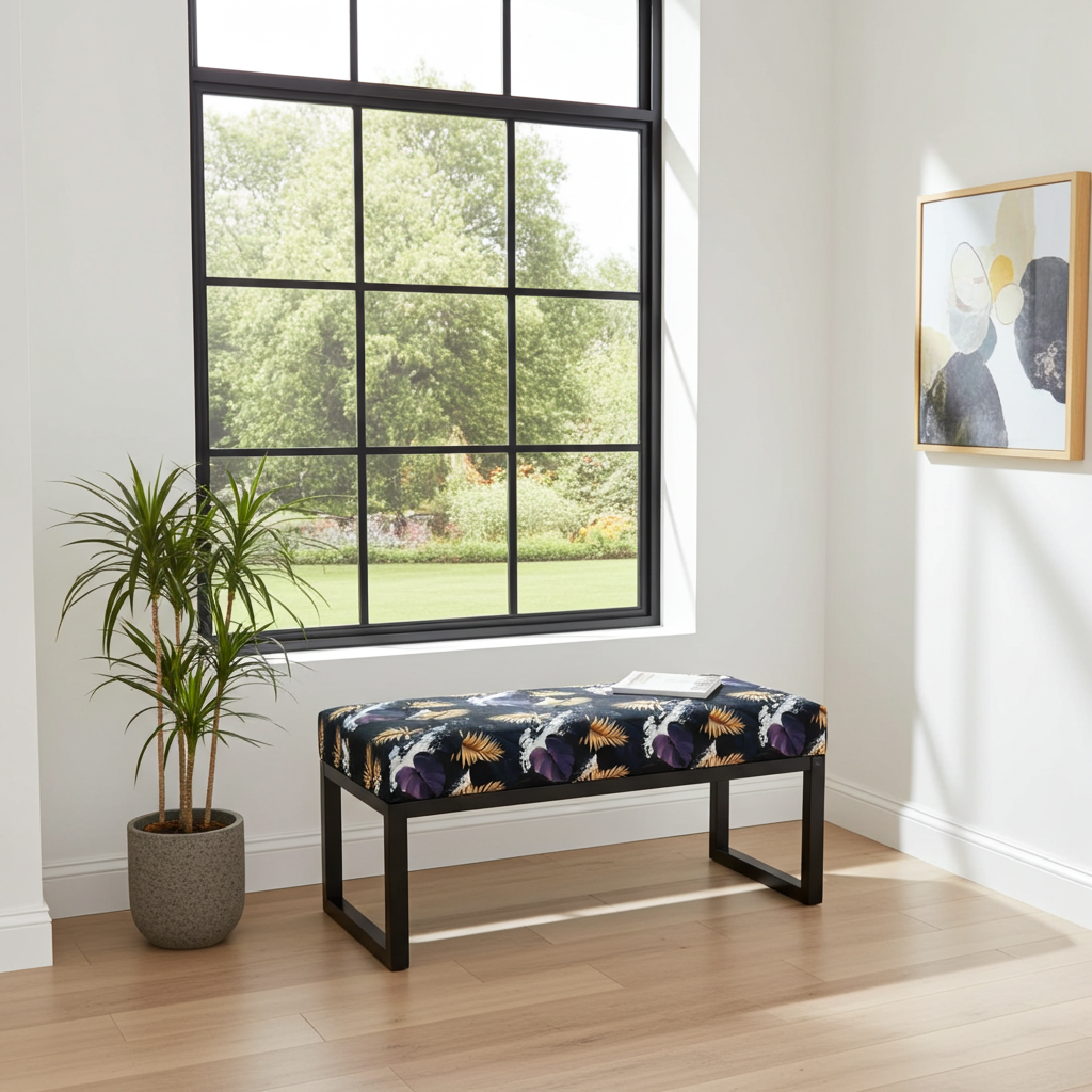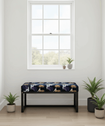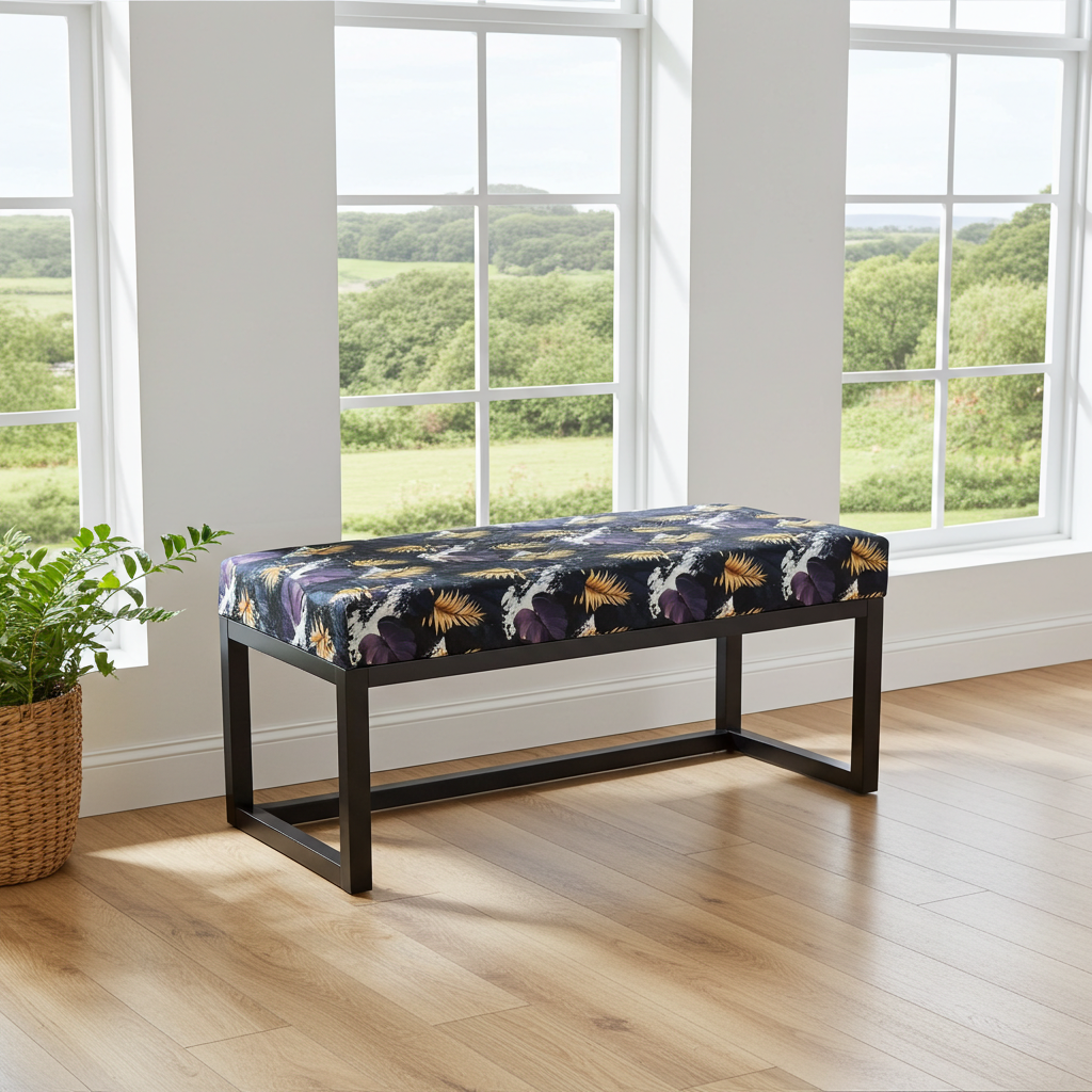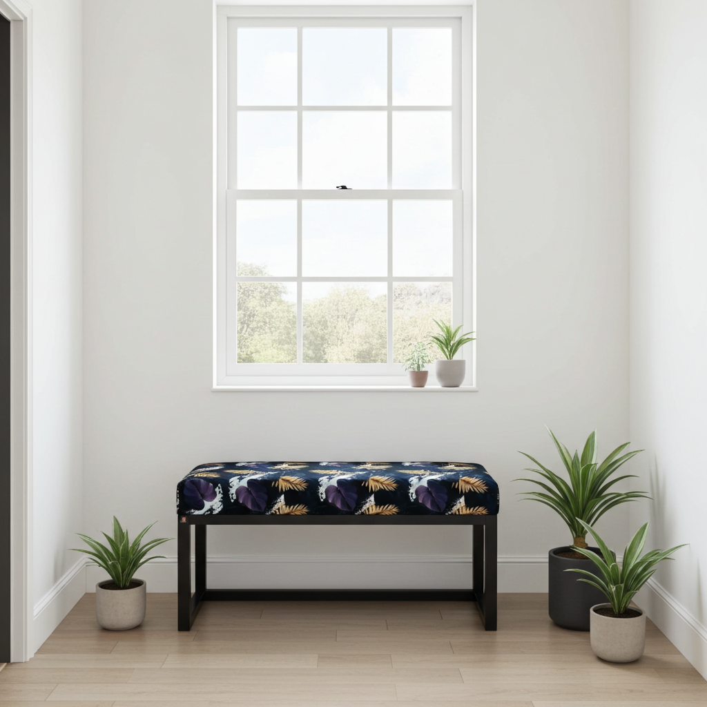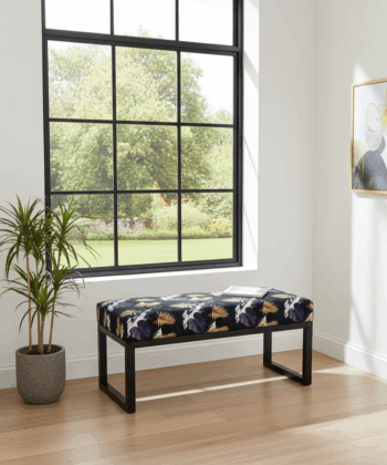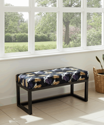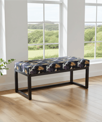 Navy floral wooden bench with black alder frame. Premium handcrafted furniture perfect for contemporary Irish homes celebrating romantic elegance and sophisticated design.