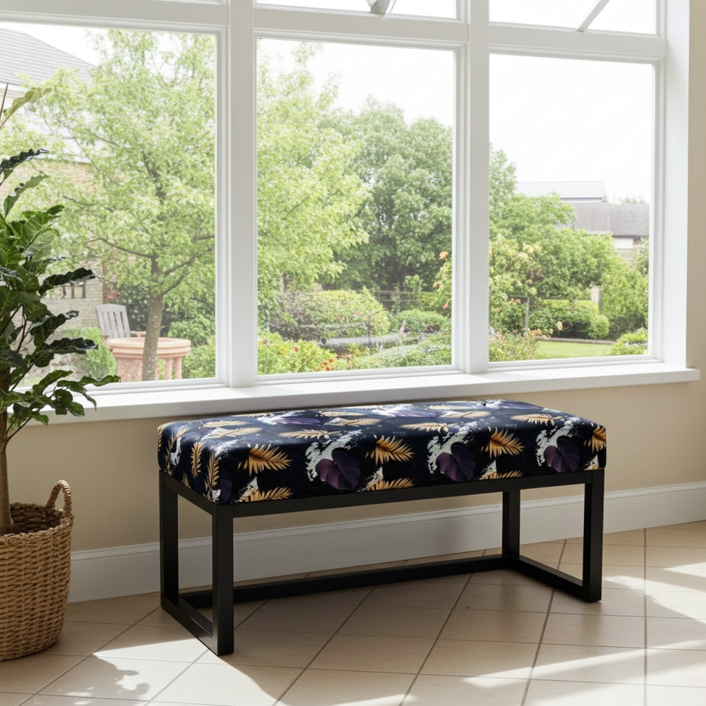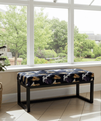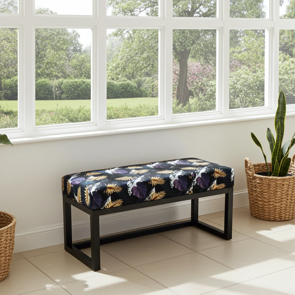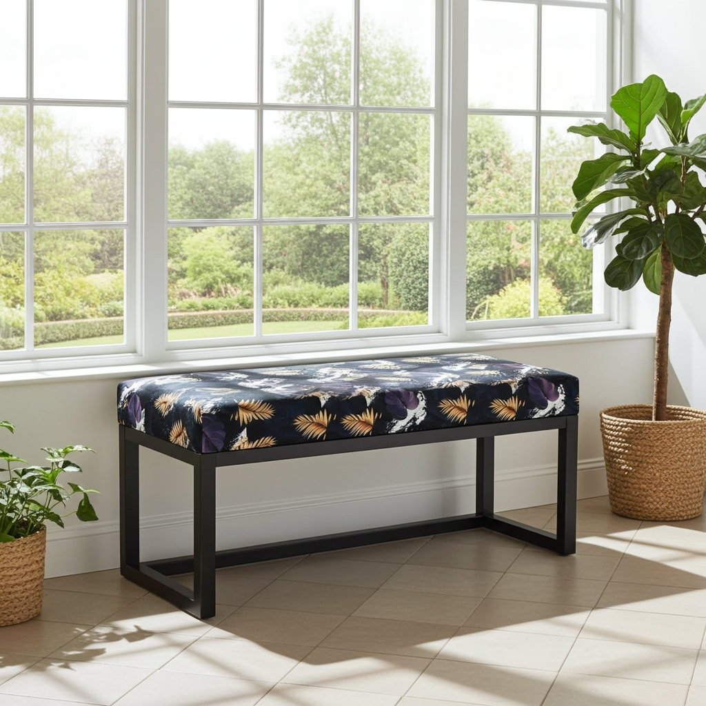 Navy floral wooden bench with black alder frame. Premium handcrafted furniture perfect for contemporary Irish homes celebrating romantic elegance and sophisticated design.