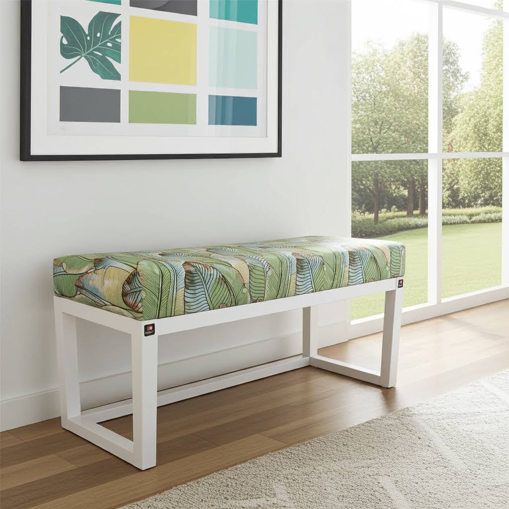 This exceptional wooden bench brings the serenity of tropical gardens indoors through its stunning green leaf-patterned velvet upholstery beautifully complemented by a pristine white alder wood frame. The lush botanical design features various shades of green leaves that create a calming, nature-inspired atmosphere while the clean white wooden structure adds Scandinavian elegance to any living space.