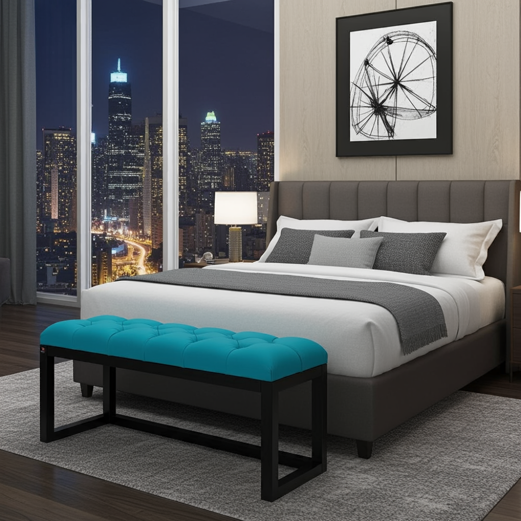 This striking bench transforms any space with vibrant turquoise velvet upholstery. Moreover, the sleek black metal cube frame adds contemporary sophistication. The bold turquoise color creates an instant focal point. Meanwhile, the geometric black structure provides modern architectural appeal.