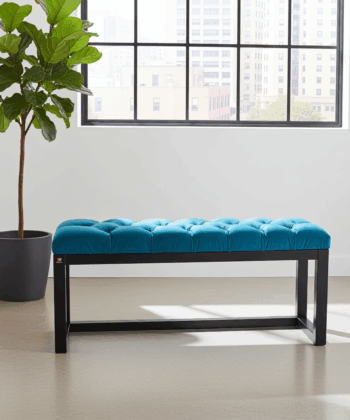 Blue velvet tufted wooden bench with black alder frame1. Premium handcrafted furniture perfect for contemporary Irish homes celebrating bold elegance and sophisticated design.