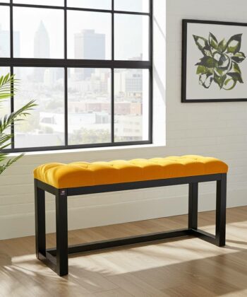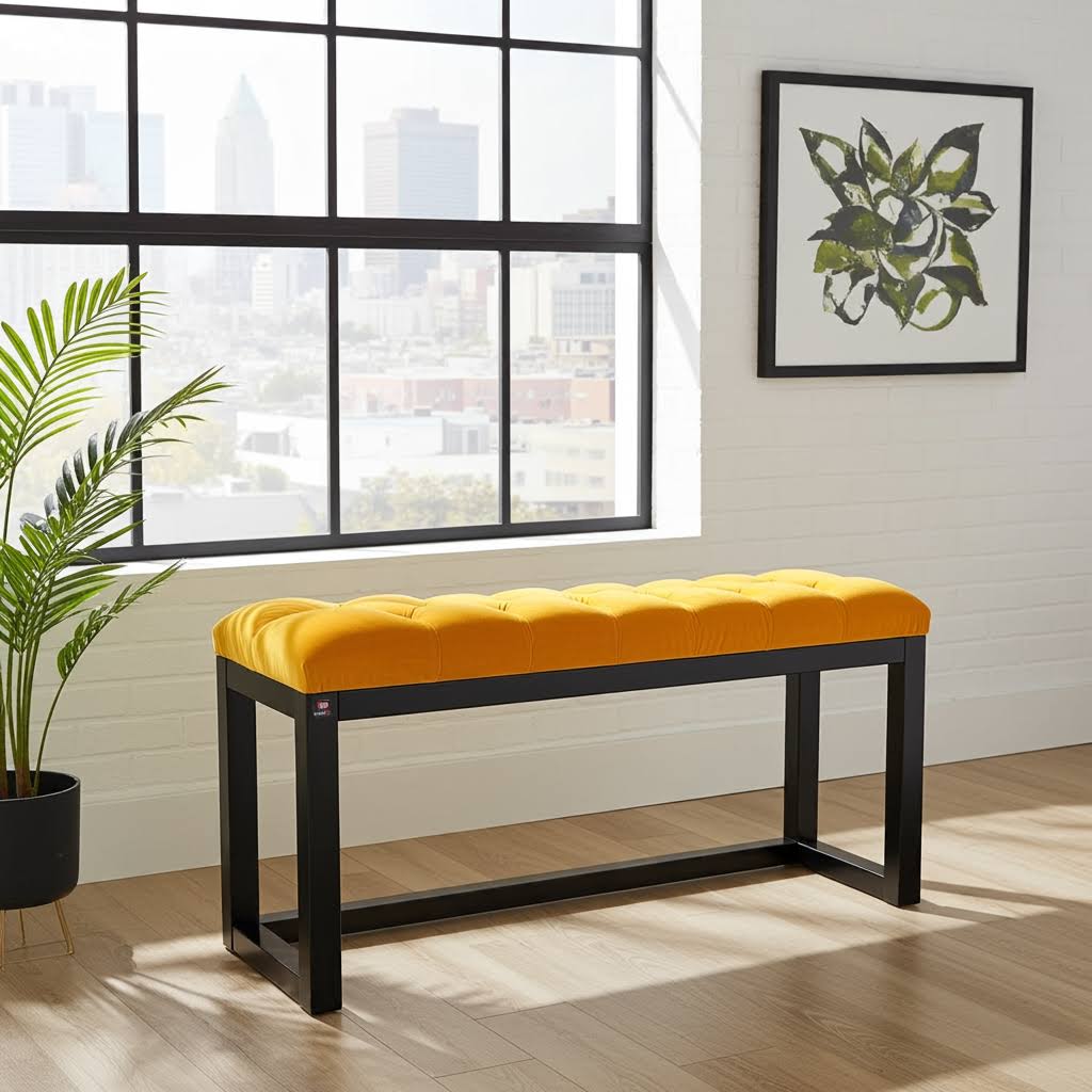 Orange velvet tufted wooden bench with black alder frame. Premium handcrafted furniture perfect for contemporary Irish homes celebrating bold elegance and vibrant design.