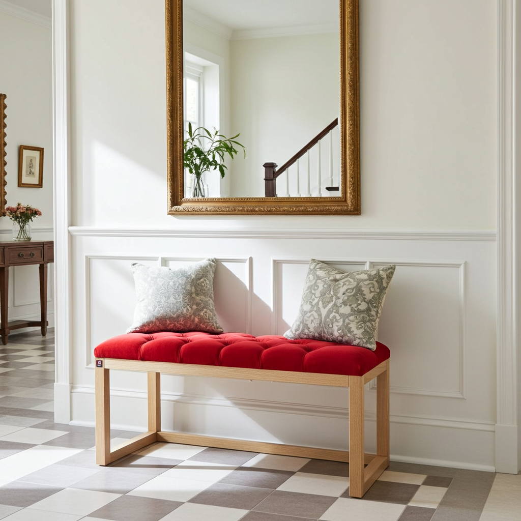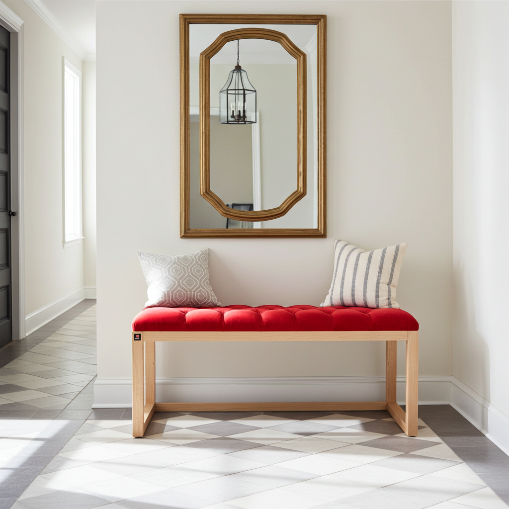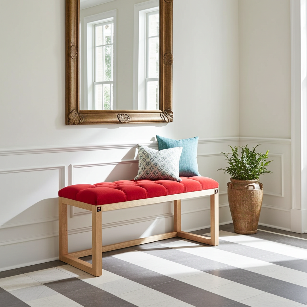 Handcrafted Designer Wooden Bench with Diamond-Tufted Red Velvet and Natural Alder Frame – Bold Elegance for Contemporary Irish Homes