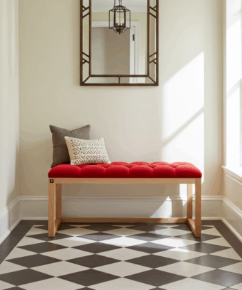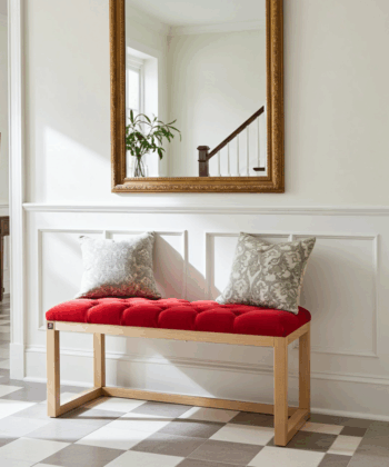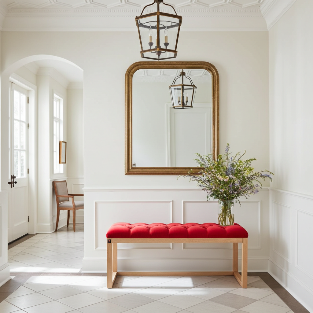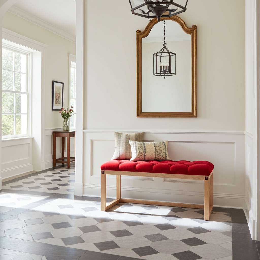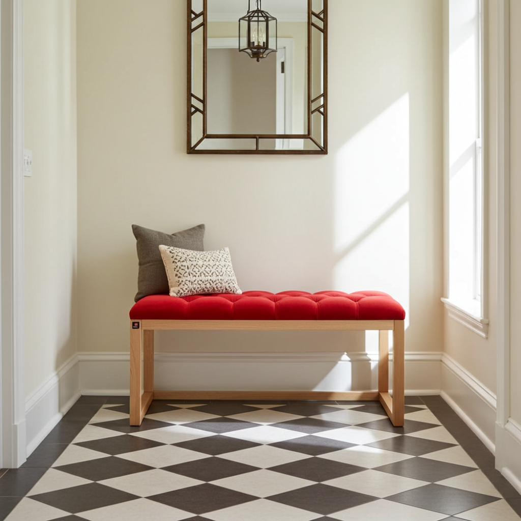 Handcrafted Designer Wooden Bench with Diamond-Tufted Red Velvet and Natural Alder Frame – Bold Elegance for Contemporary Irish Homes