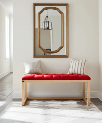 Red velvet tufted wooden bench with natural alder frame. Premium handcrafted furniture perfect for contemporary Irish homes celebrating bold elegance and natural wood beauty.