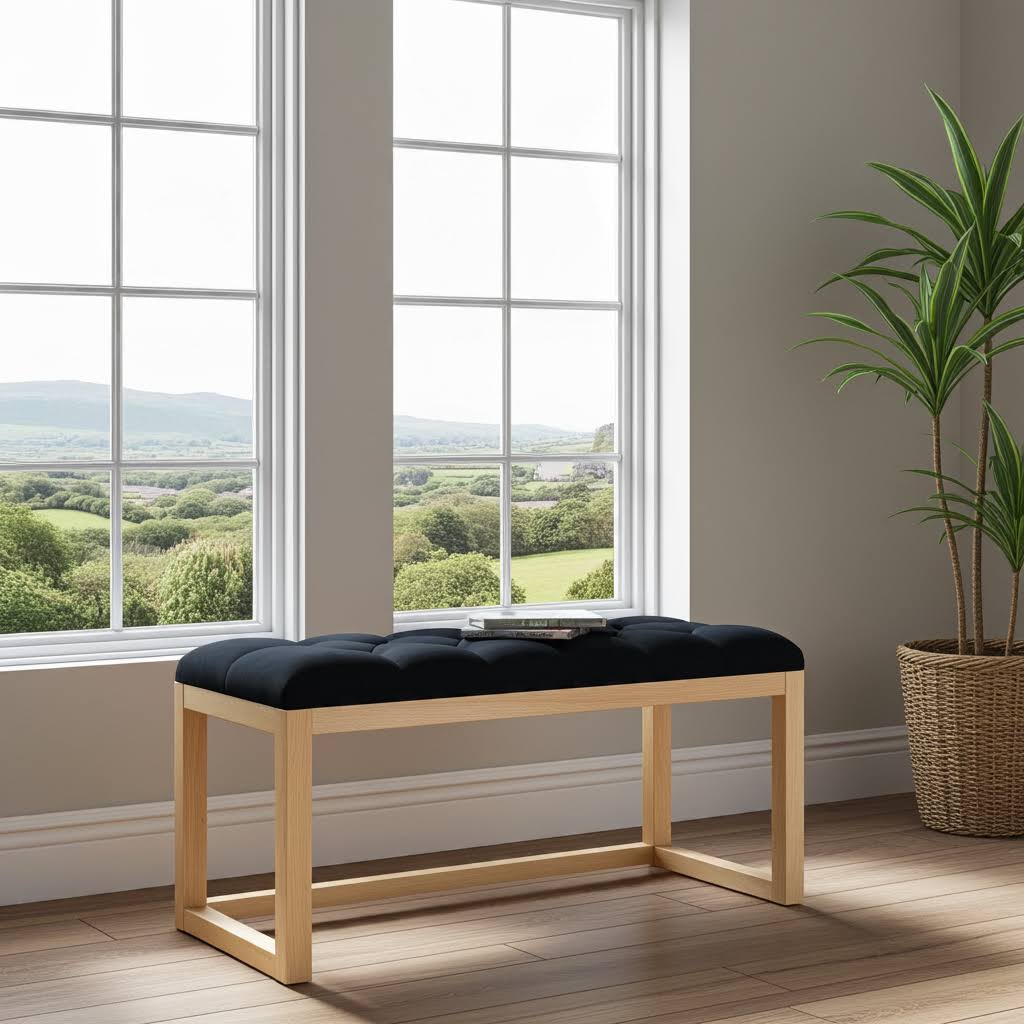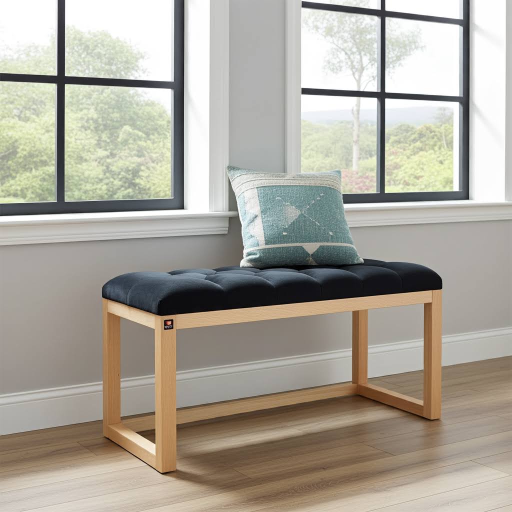 Enhance your home with this elegant wooden-framed velvet bench (100x40cm). The plush, button-tufted velvet seat provides luxurious comfort and a refined look. The sturdy alder wood frame, shown here in a natural finish, is also available in white or black, letting you tailor the bench to your décor. Its minimalist geometric design fits seamlessly into living rooms, bedrooms, hallways, or at the foot of a bed12.