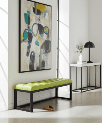 Lime green eco-leather bench with ebony alder frame. Premium handcrafted furniture perfect for contemporary Irish homes celebrating bold sustainability and dynamic design.