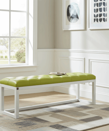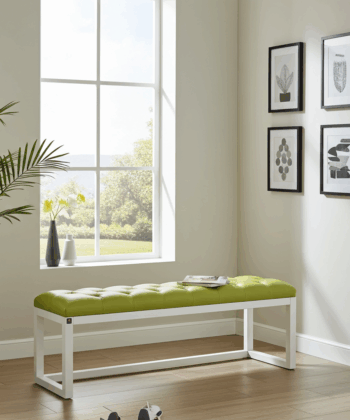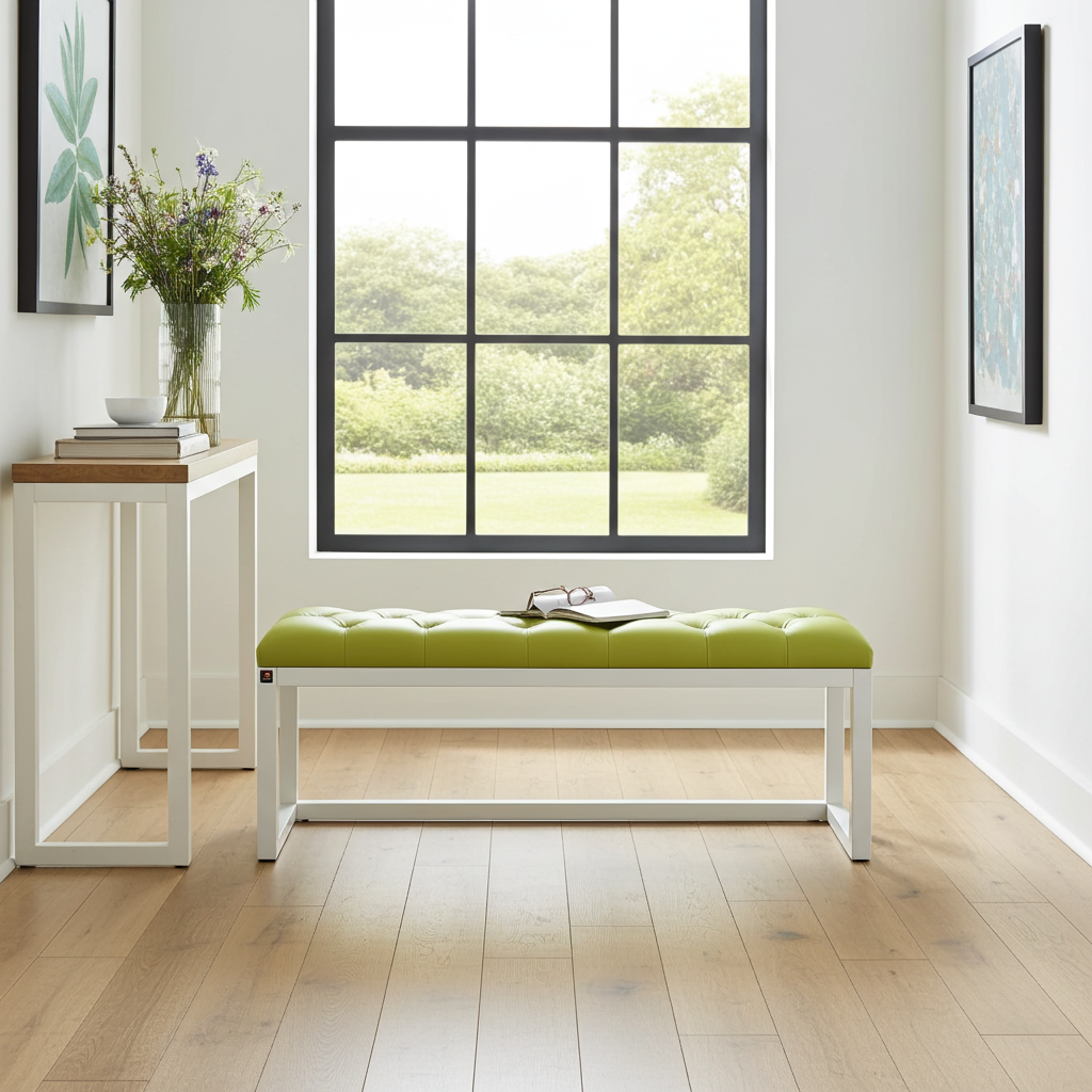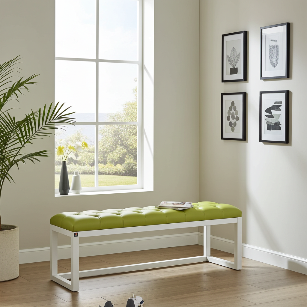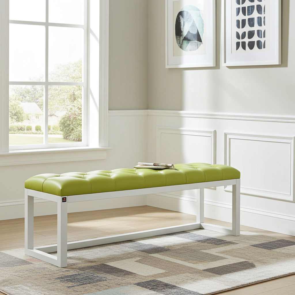 This exceptional bench revolutionizes sustainable design through its striking olive green eco-leather upholstery. Expert diamond-quilted artistry creates captivating texture and visual sophistication. Meanwhile, the pristine white alder frame provides clean contemporary contrast. The vibrant olive hue instantly energizes any space with nature-inspired elegance.