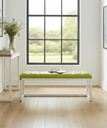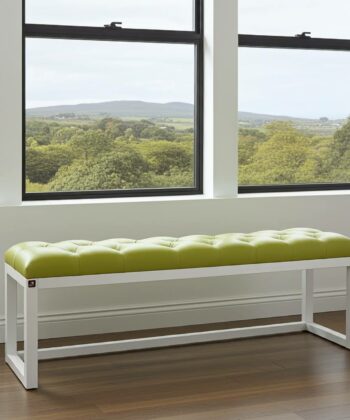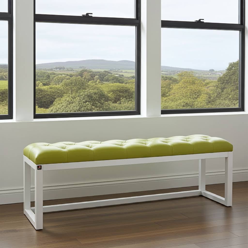 Olive green eco-leather bench with white alder frame. Premium handcrafted furniture perfect for contemporary Irish homes celebrating natural sustainability and organic design