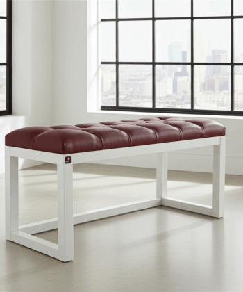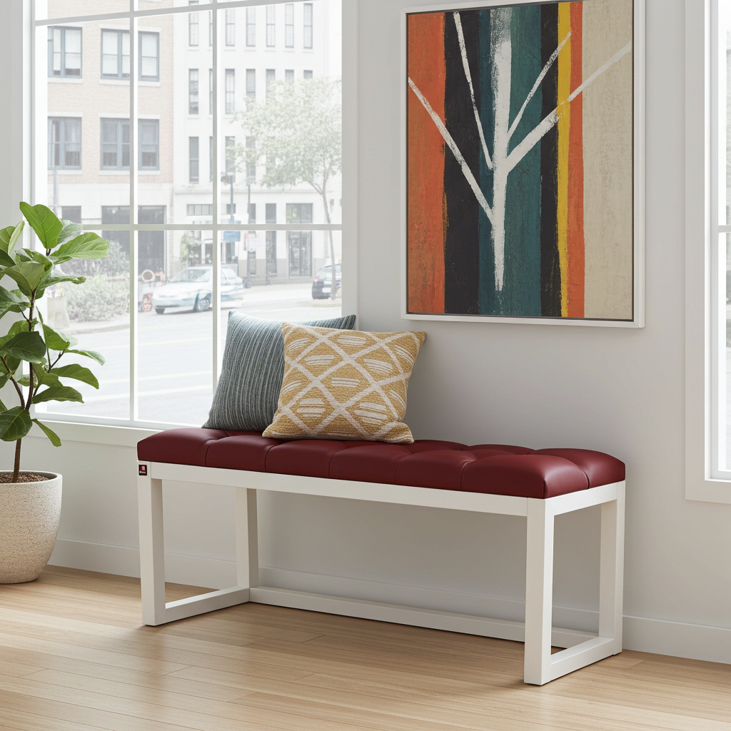 Red eco-leather tufted wooden bench with white alder frame. Premium handcrafted furniture perfect for contemporary Irish homes celebrating bold elegance and sustainable design.