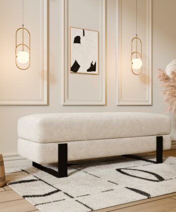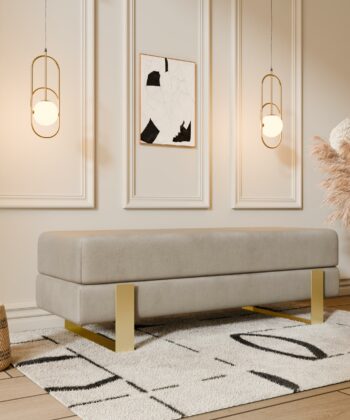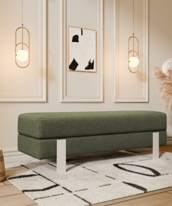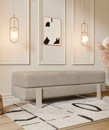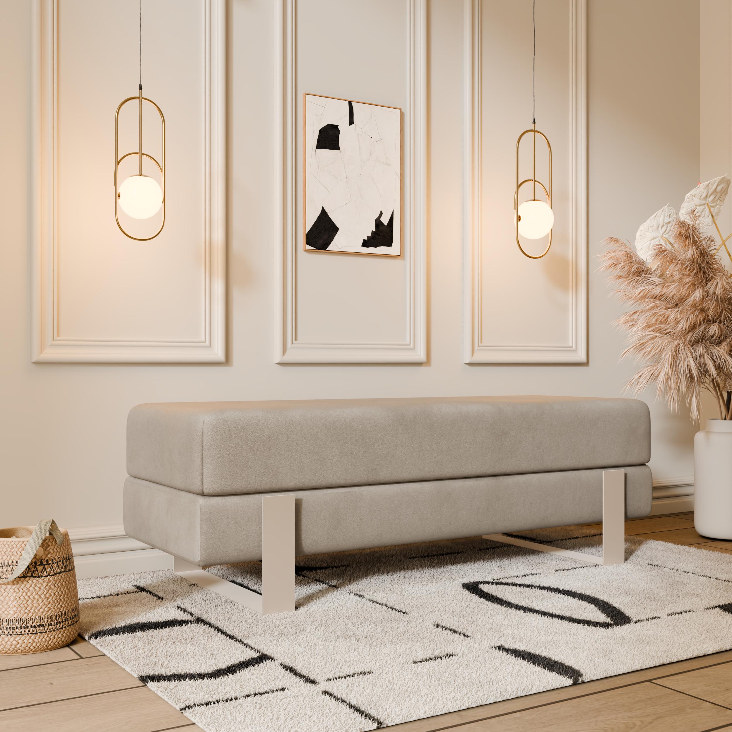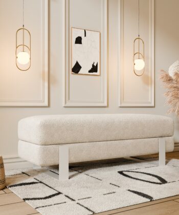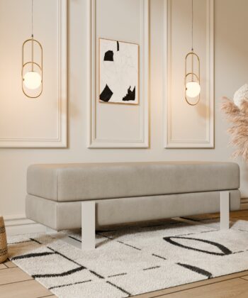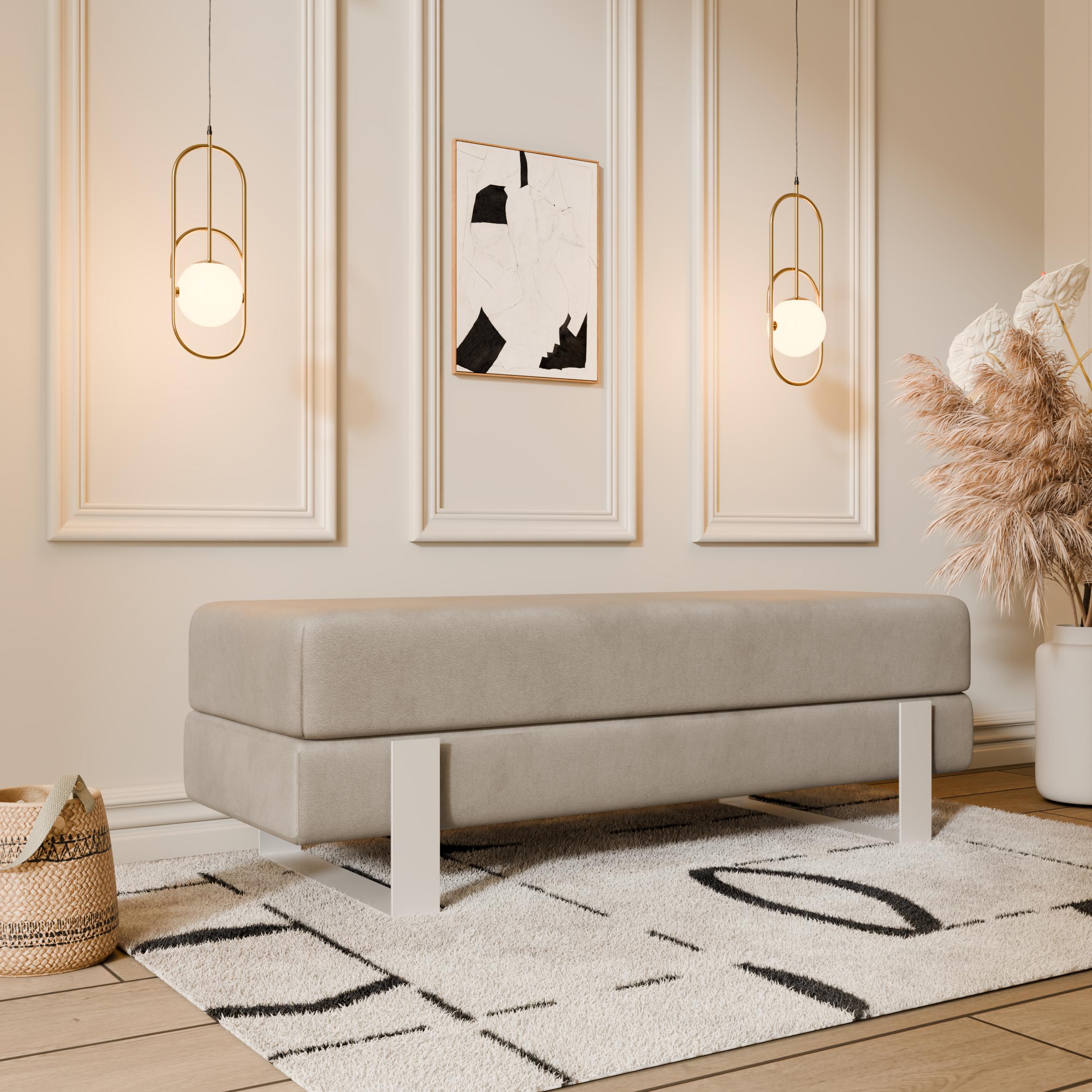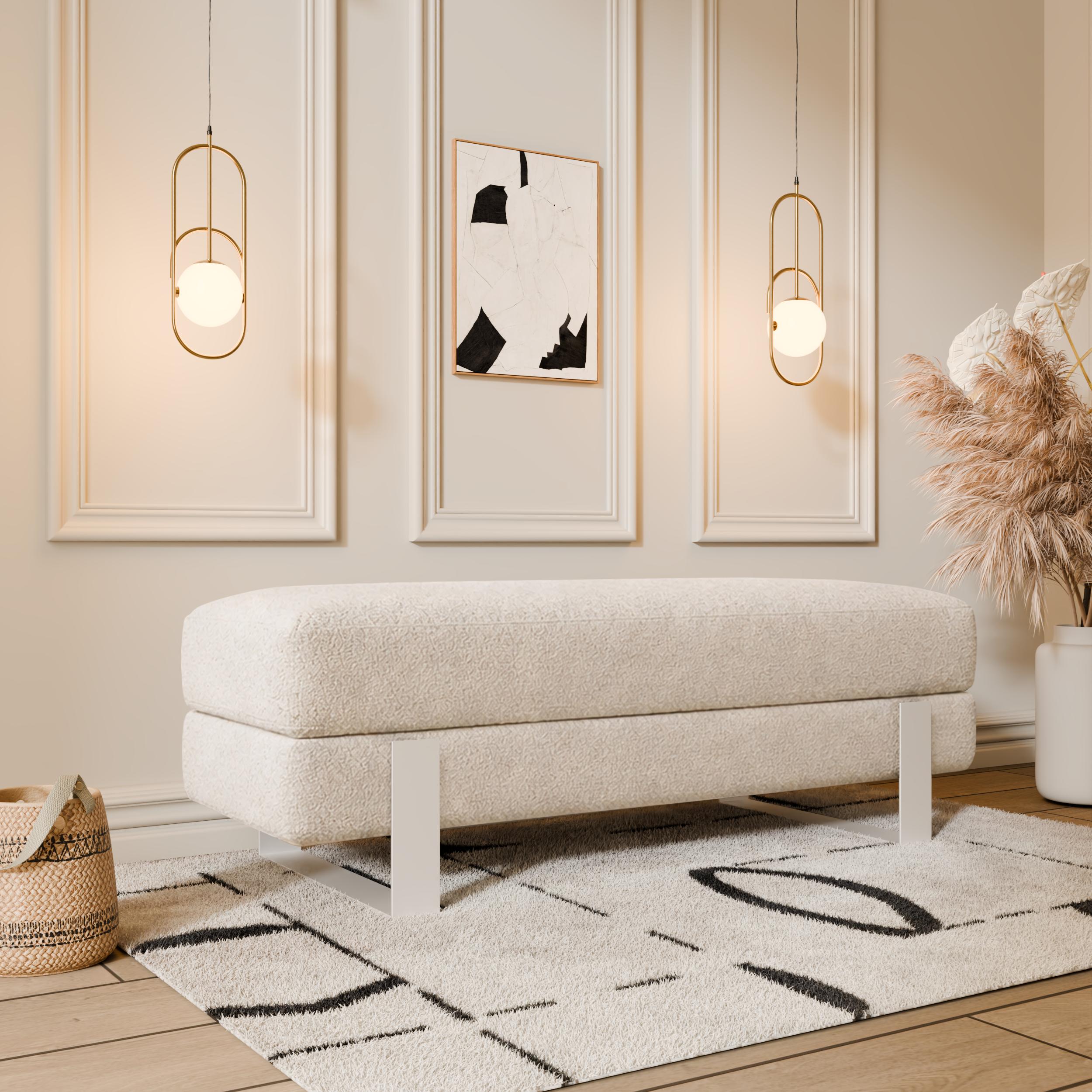 Arena bench adds instant elegance. Creamy velvet glows luxurious. Slim white legs keep it light. 100×35 cm fits anywhere perfect. 47 cm height welcomes everyone.