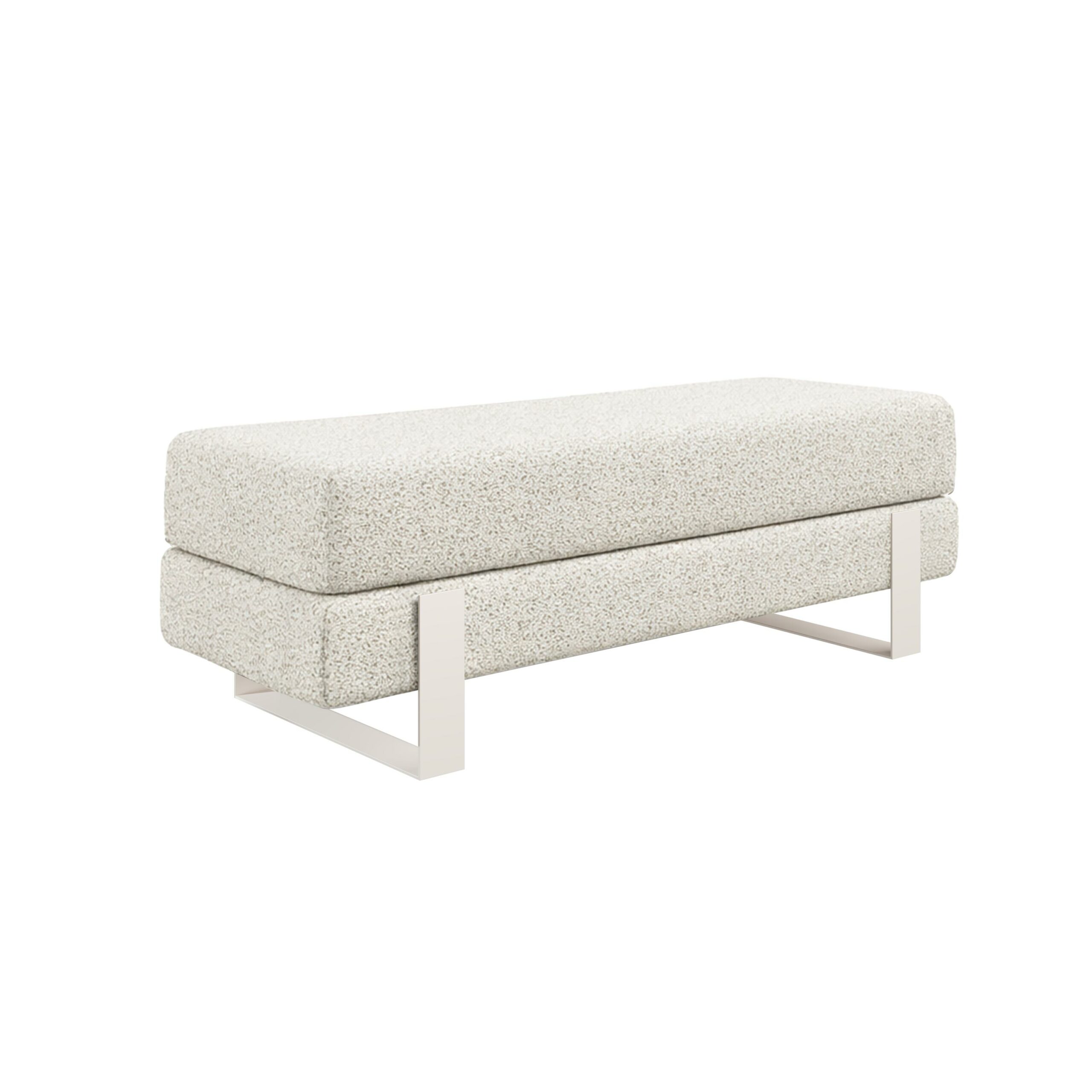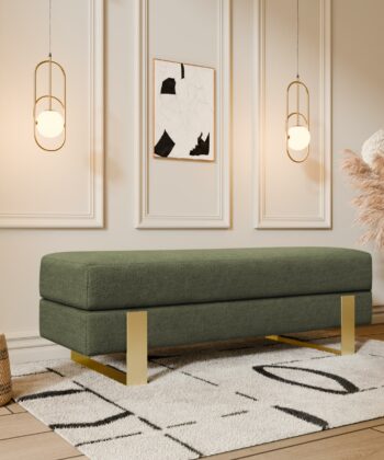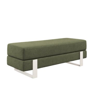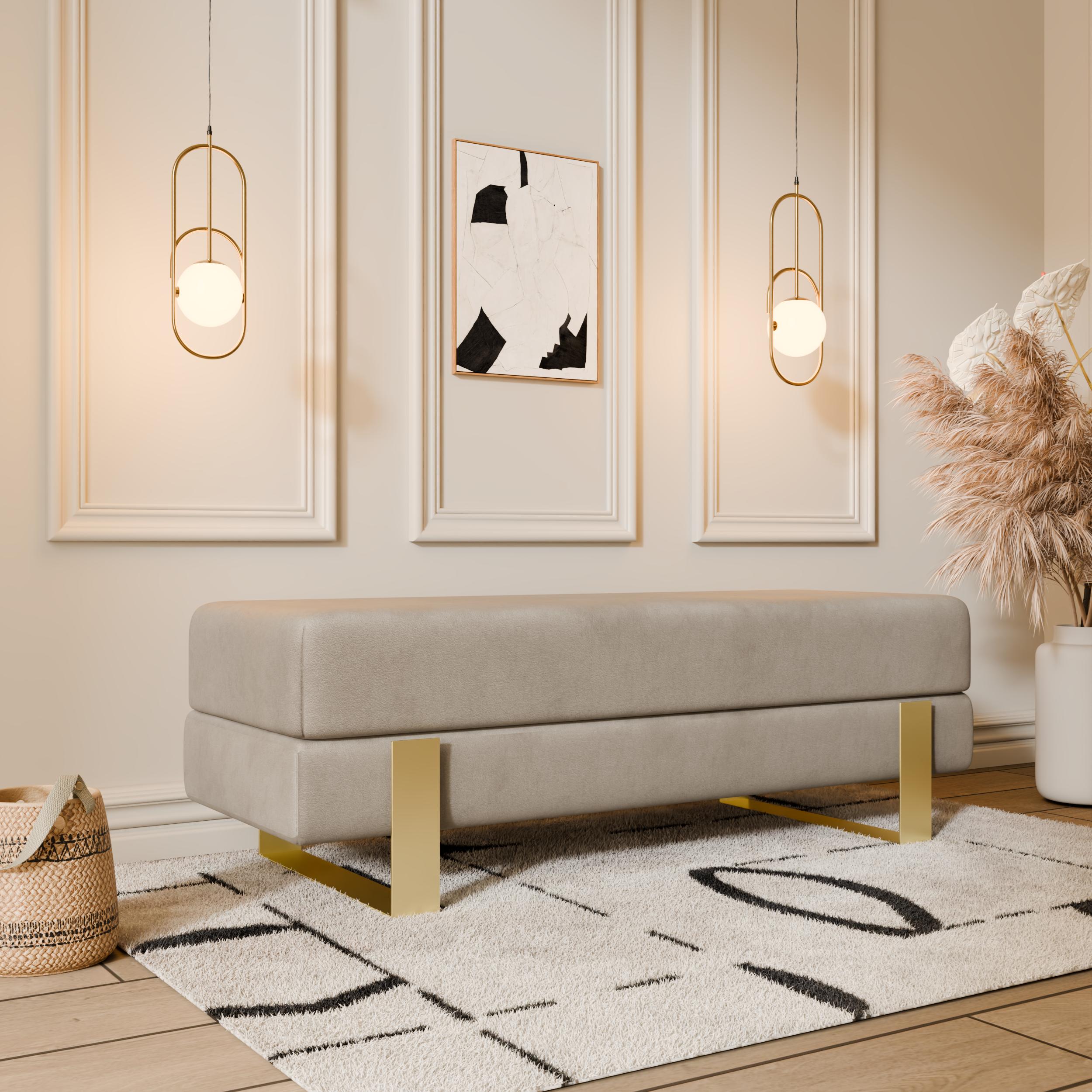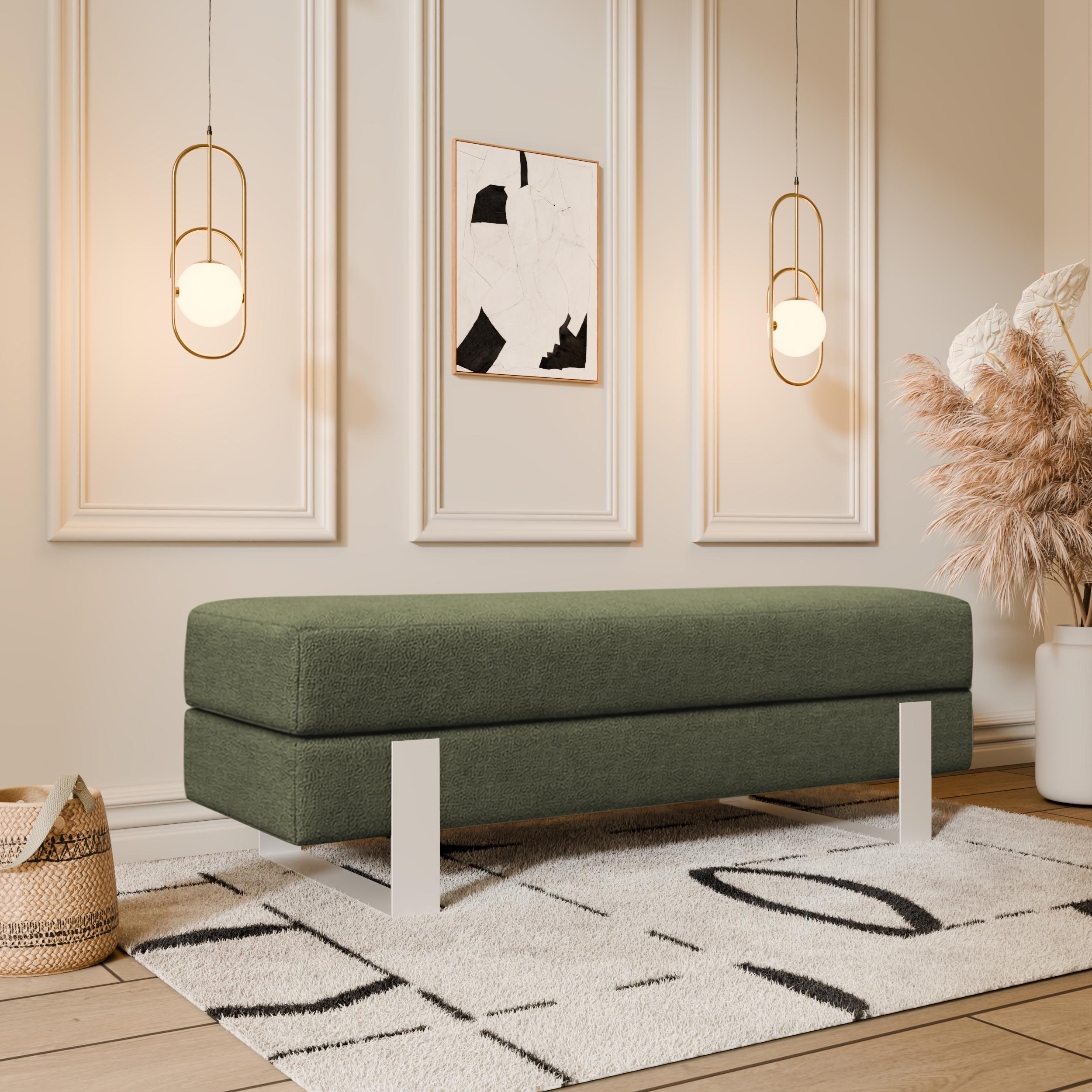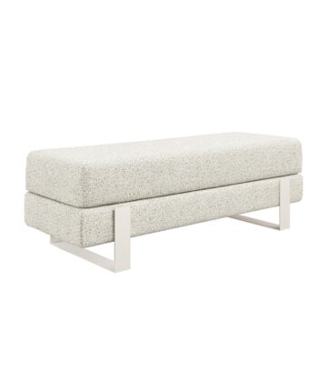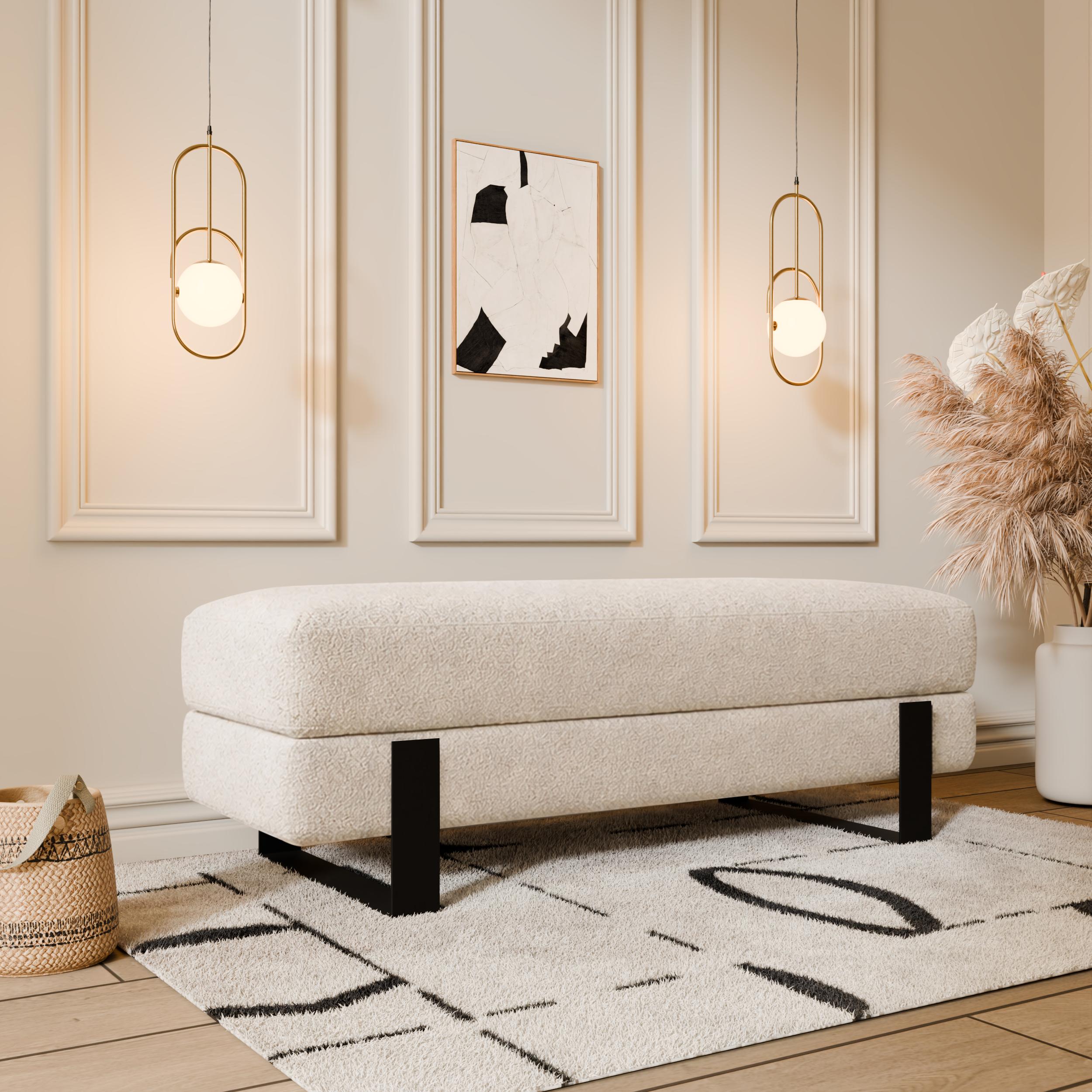 Arena bench adds instant elegance. Creamy velvet glows luxurious. Slim white legs keep it light. 100×35 cm fits anywhere perfect. 47 cm height welcomes everyone.