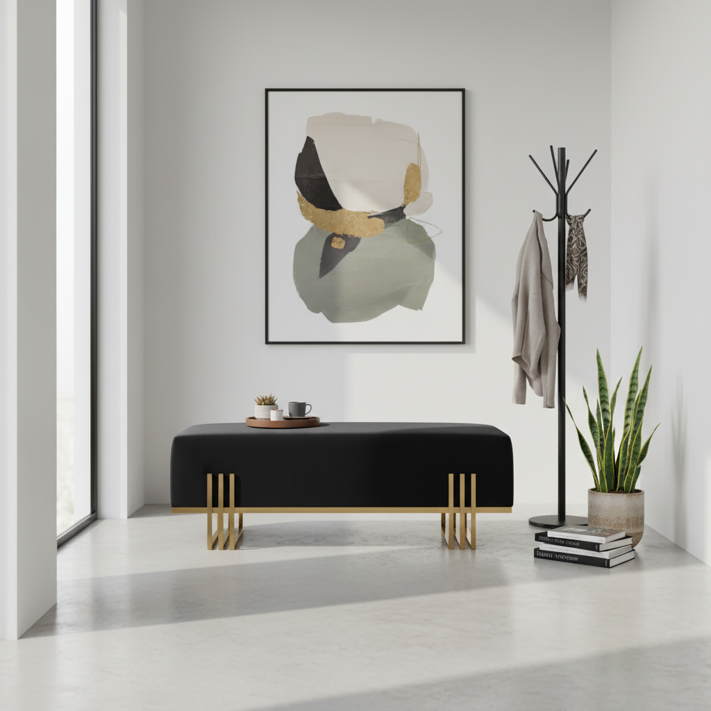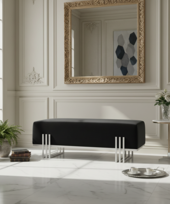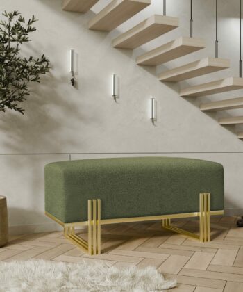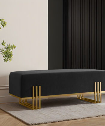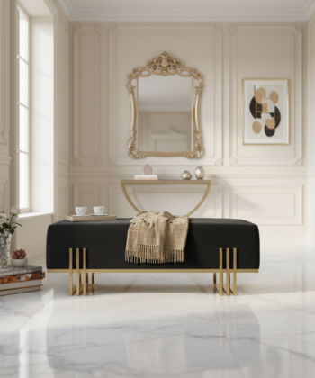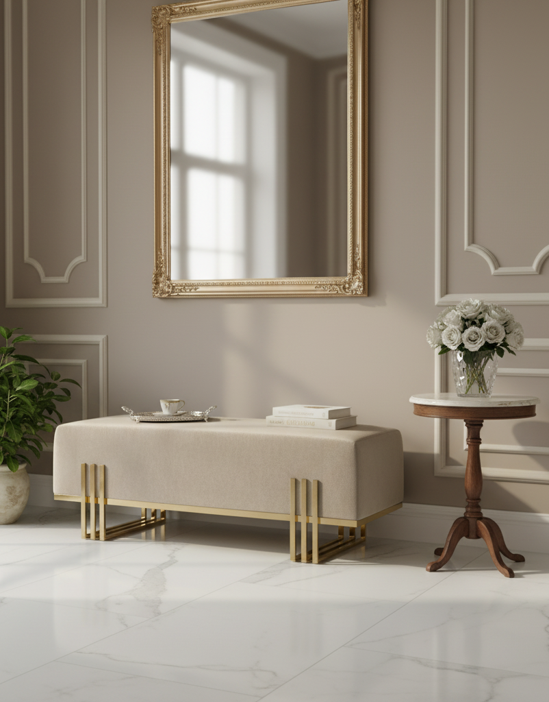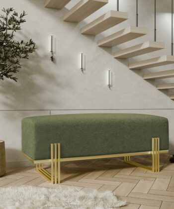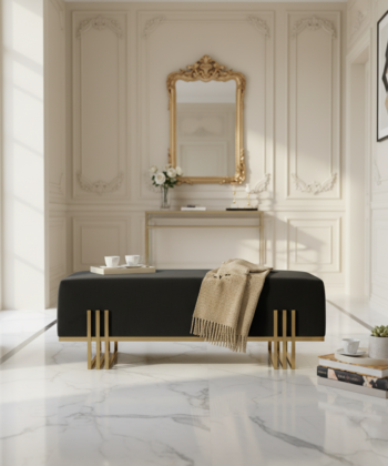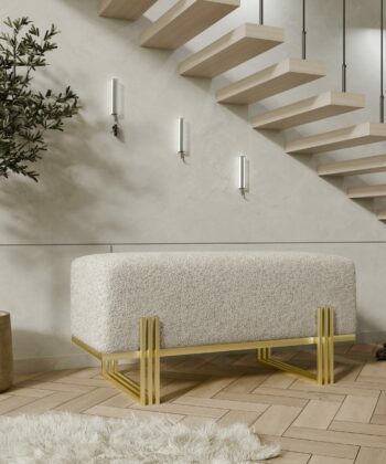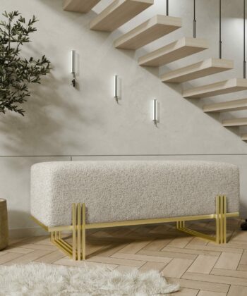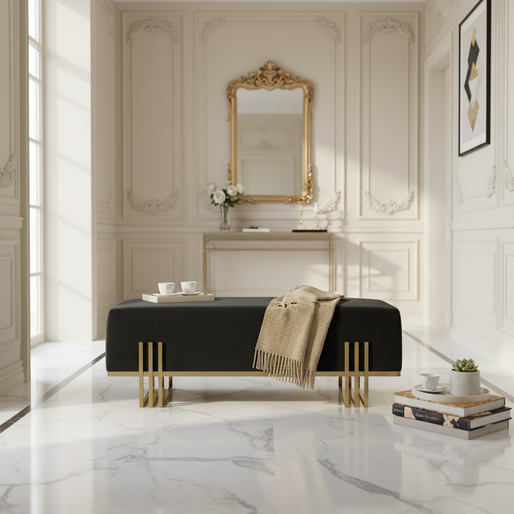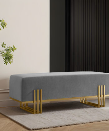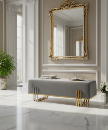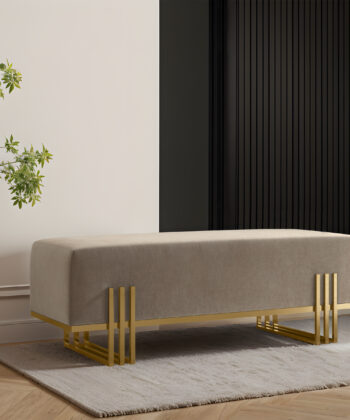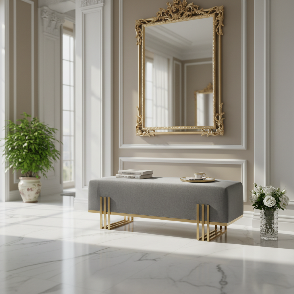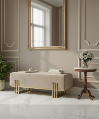 Make a statement with the Aurora Modern Upholstered Bench in extended 100×35×47 cm size. This longer version offers generous seating for two plus decorative versatility. First, the expansive rectangular seat welcomes guests, stores blankets, or displays trays elegantly. Meanwhile, the signature gold metal base delivers architectural glamour perfect for sophisticated spaces.