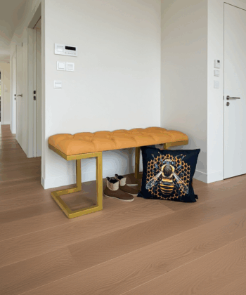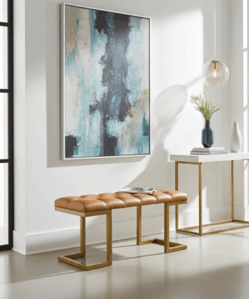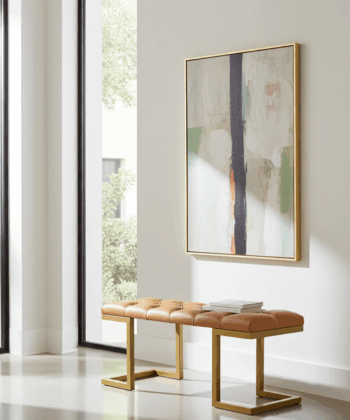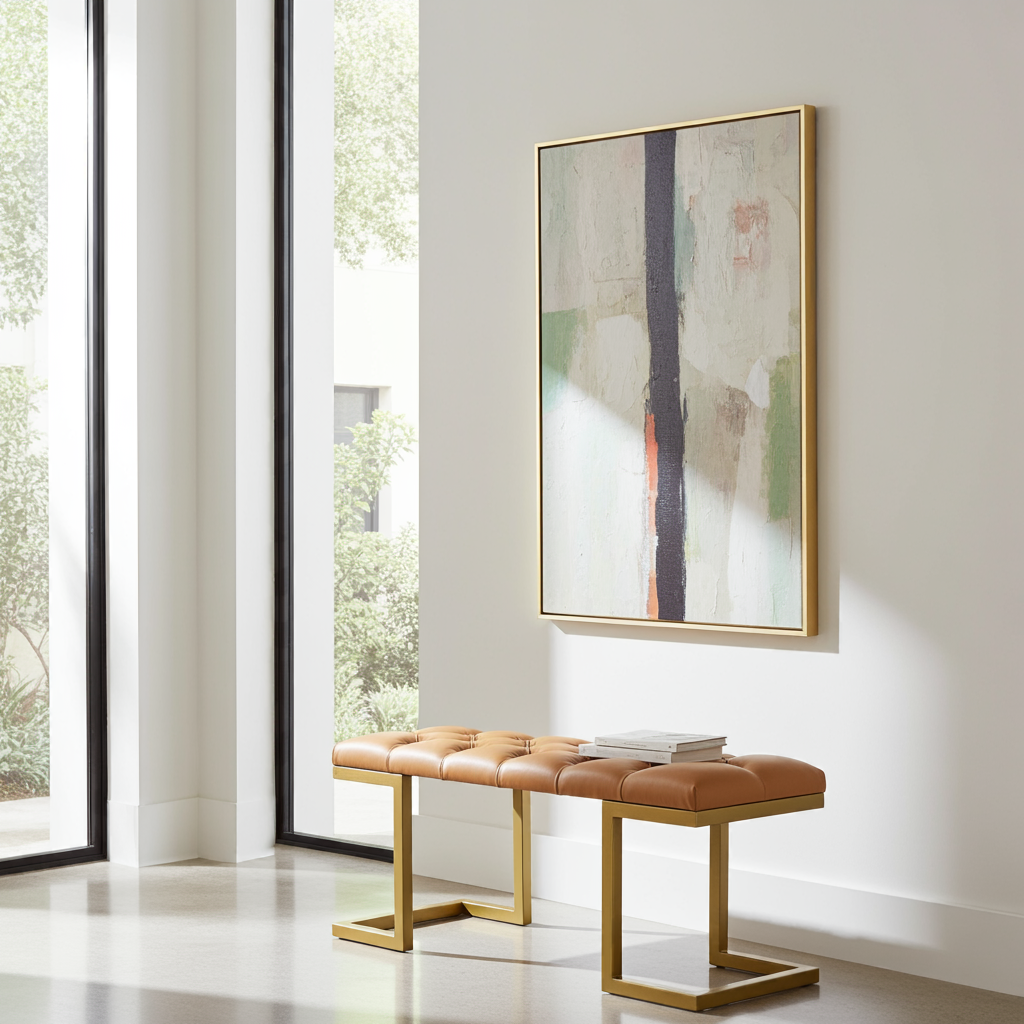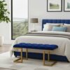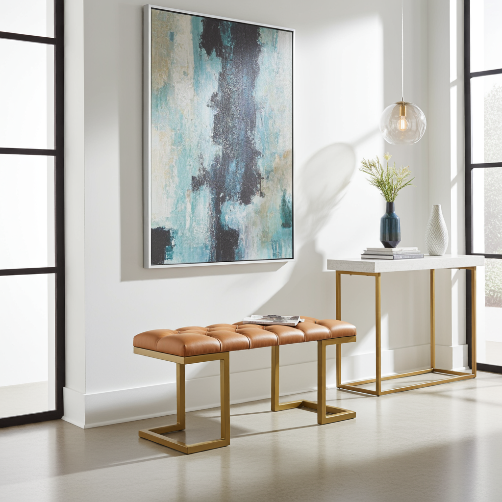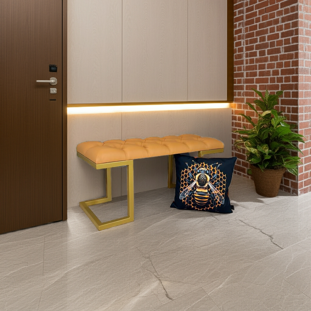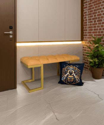 Additionally, the sturdy gold frame ensures excellent stability and resists daily wear and tear. The bench’s compact size allows for easy placement in hallways, bedrooms, or living rooms. Furthermore, the geometric frame and tufted seat create a sophisticated look that suits both contemporary and classic décor.